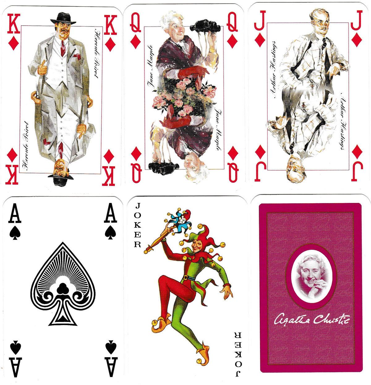 It is a standard pack with the exception of the court cards, which are repeated in each suit. The Kings are Hercule Poirot; the Queens are Miss Jane Marple, and the Jacks are Captain Arthur Hastings, the companion-chronicler and best friend of Hercule Poirot. He is also the narrator of several of Christie’s novels. The back of the cards has an oval photograph of Agatha Christie with her printed autograph below.