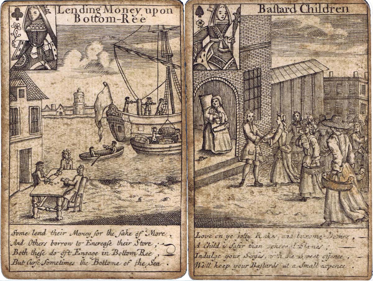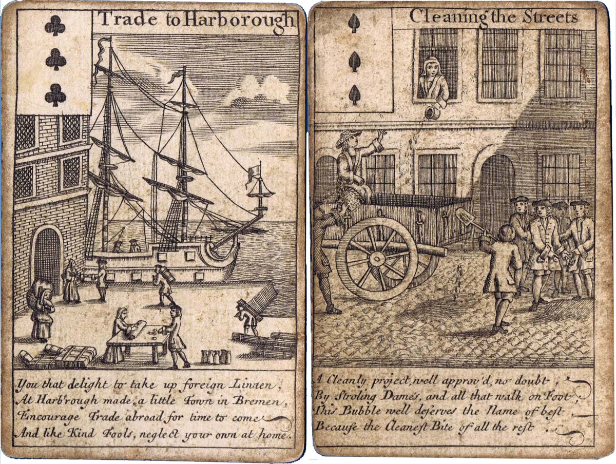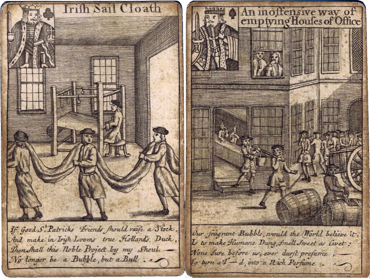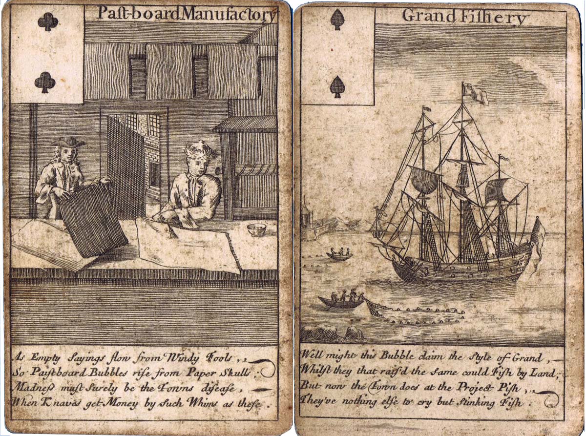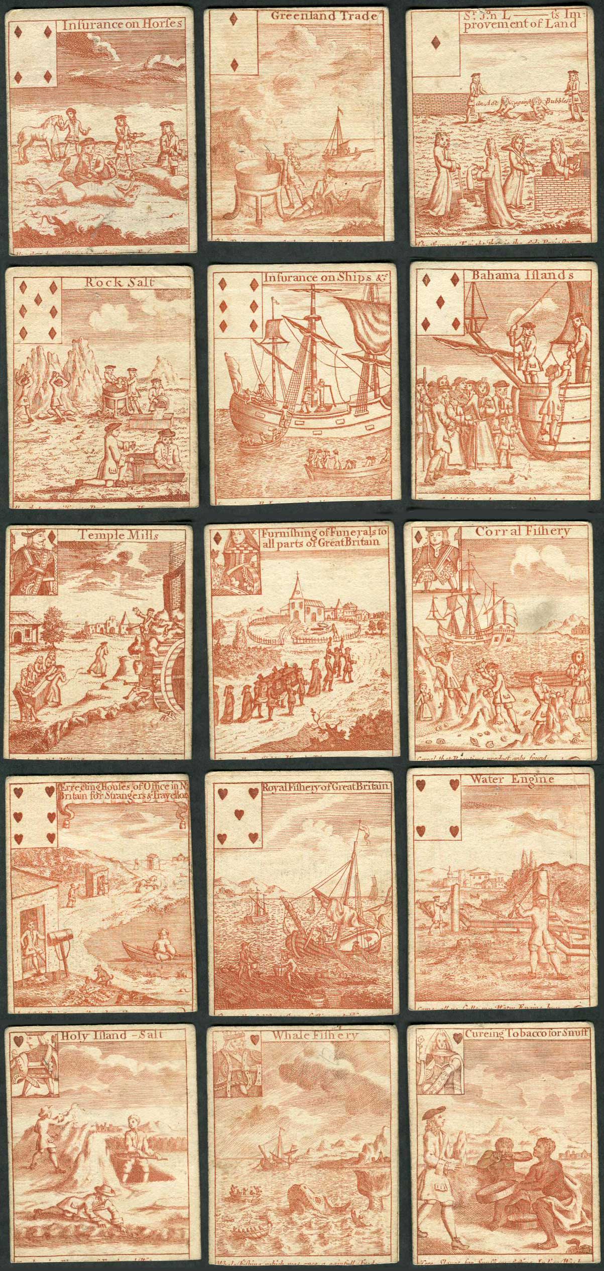 Above: Bubble Cards - known as “All the Bubbles”, c.1720. 52 cards. Each card portrays a drawing, with a title above and a verse below, of a scam that was offered in Coffee Houses and in Exchange Alley, London. “An inoffensive way of emptying House of Office” (King of Spades) referred to the gunpowder plot.