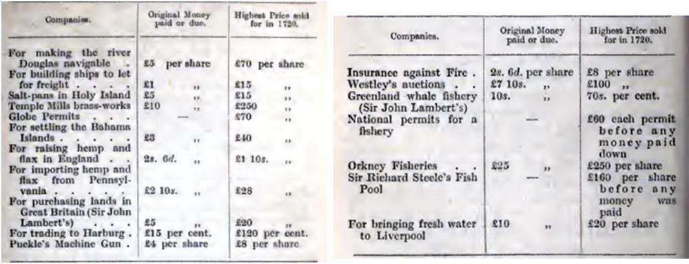 Above: an extract from The South Sea Bubble by Lewis Melville gives an idea of how the stocks moved. You can see that the “Insurance against Fire” stock hit a high of 64 times it’s issue price!