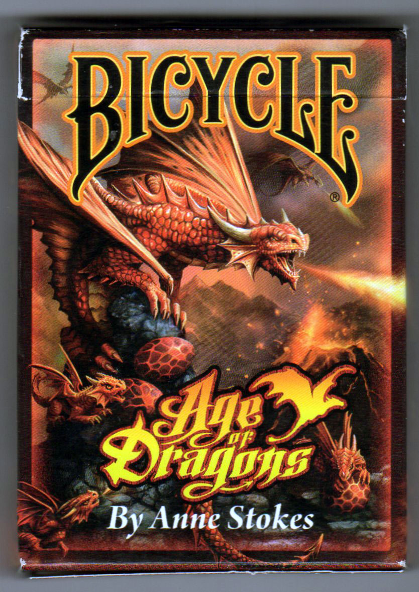 Above: “Age of Dragons” fantasy playing cards with artwork by Anne Stokes, produced on premium Bicycle® brand cardstock by USPCC, 2017. 52 cards plus 2 jokers + extra card in box.