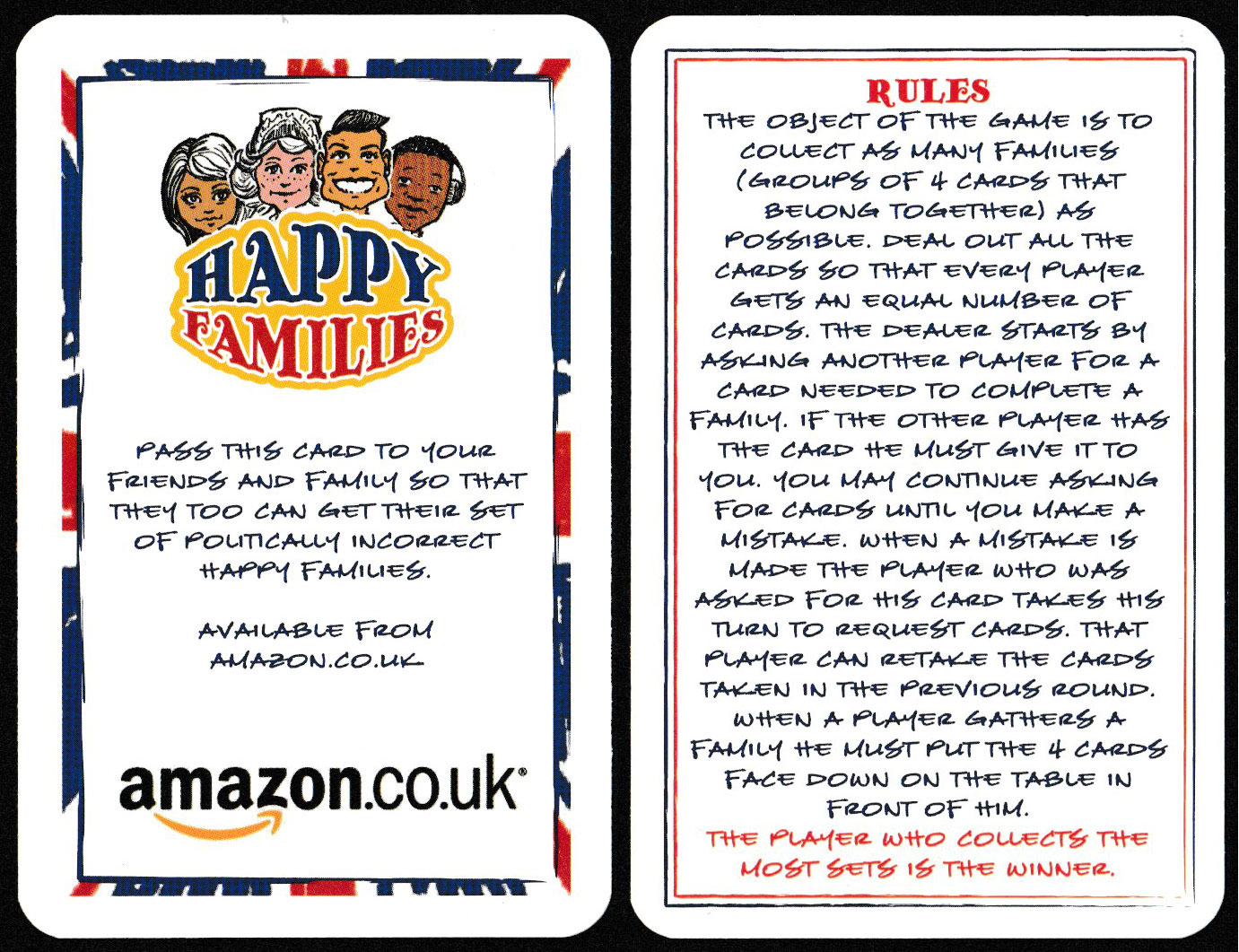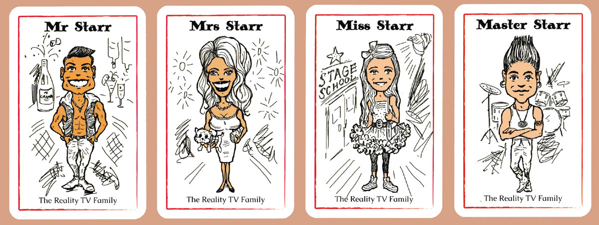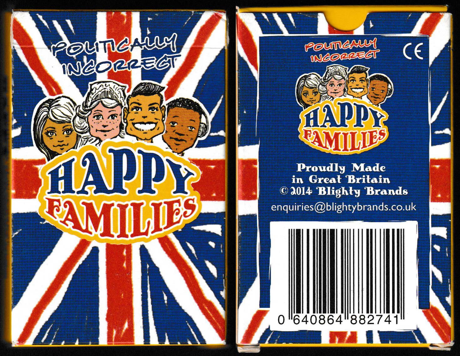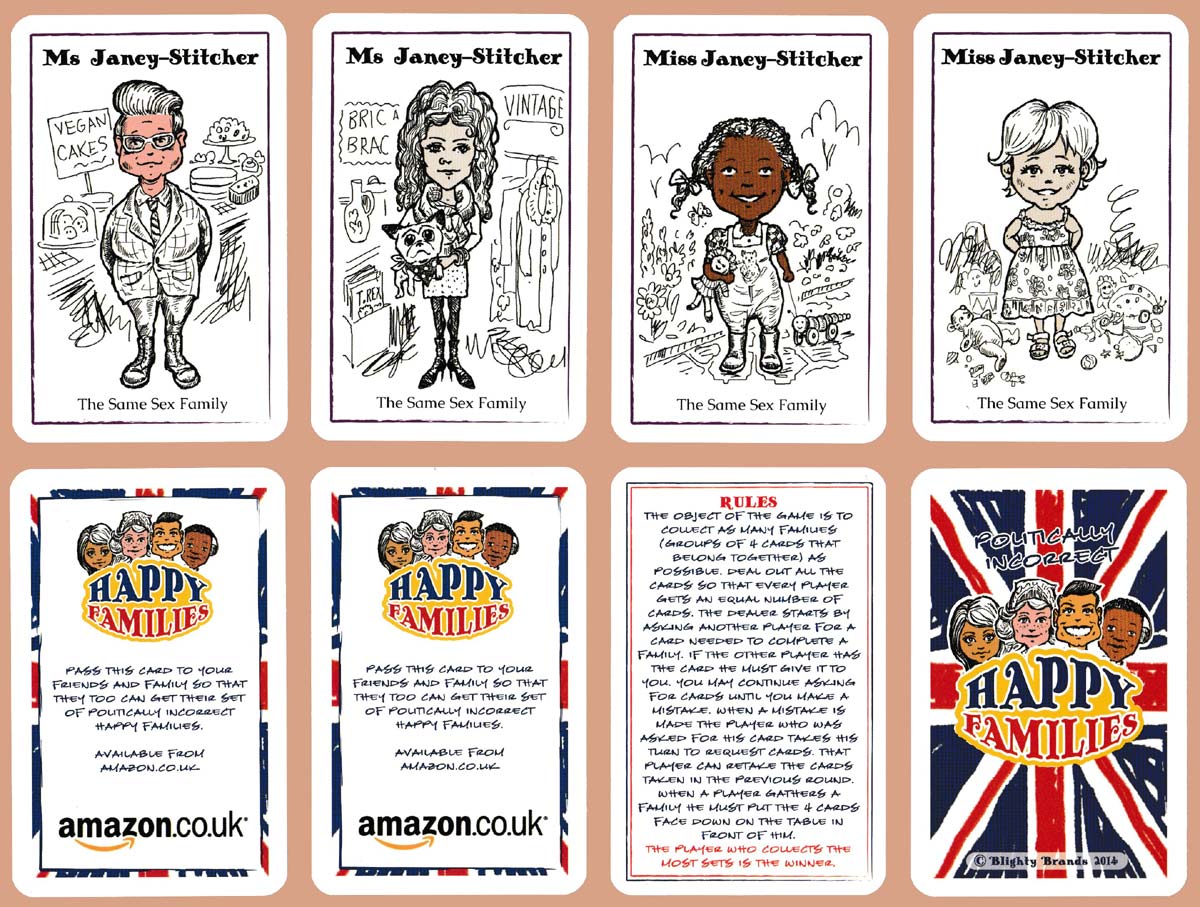 Above: Politically Incorrect Happy Families, made in Great Britain for Blighty Brands, 2014. 36 cards + 1 rule card + 3 extra cards in tuck box, on see-through board. Size: 56 x 87 mm.