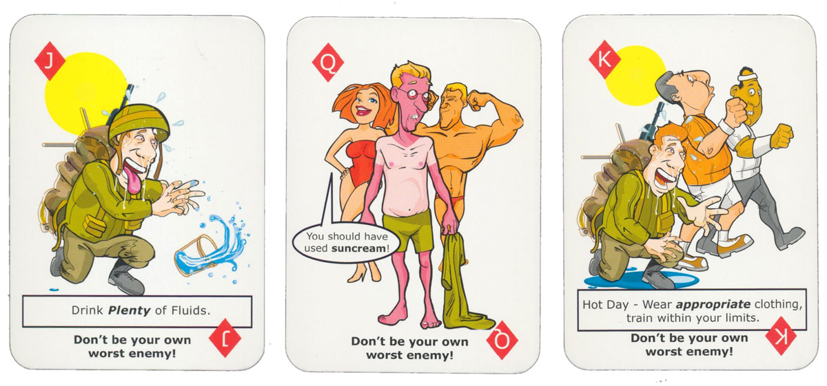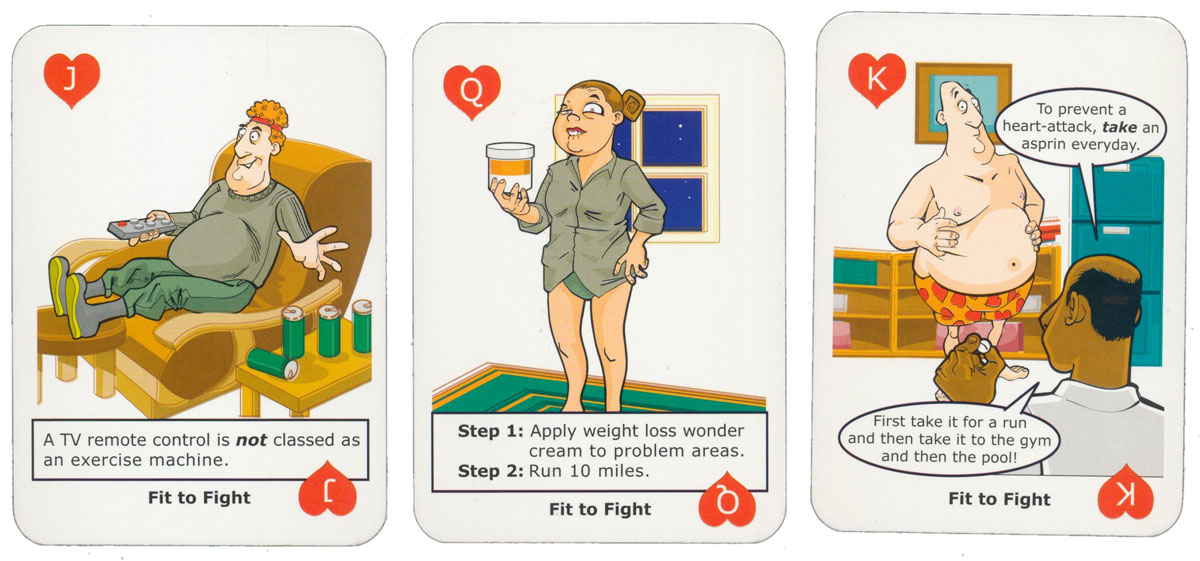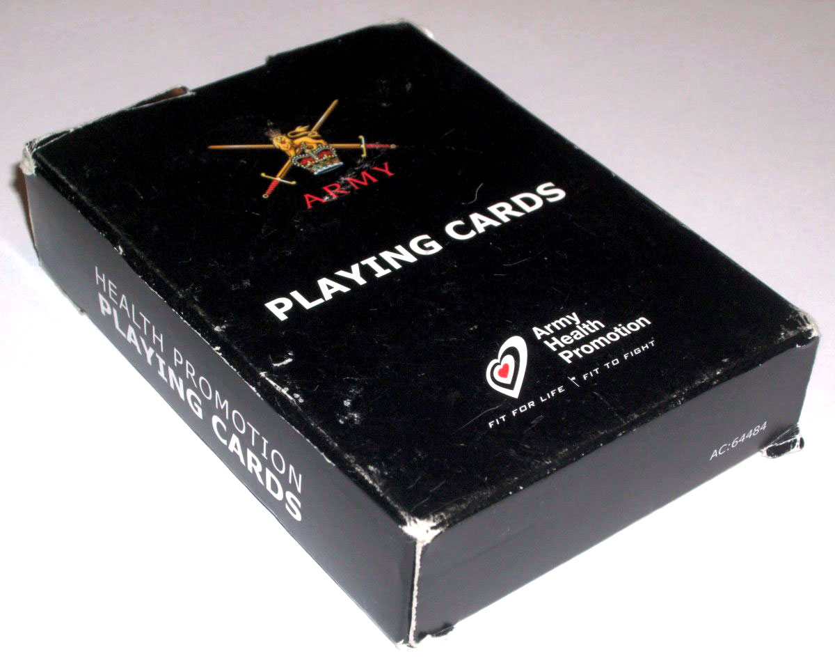 Above: Army Health Promotion playing cards issued by the British Army, 2011. 52 cards + 2 jokers + exra info card in box. The back has the British Army insignia (lion atop crown over crossed swords) with the text “Army Health Promotion” “Fit for Life ¦ Fit to Fight” printed below in white. Images courtesy Matt Probert.