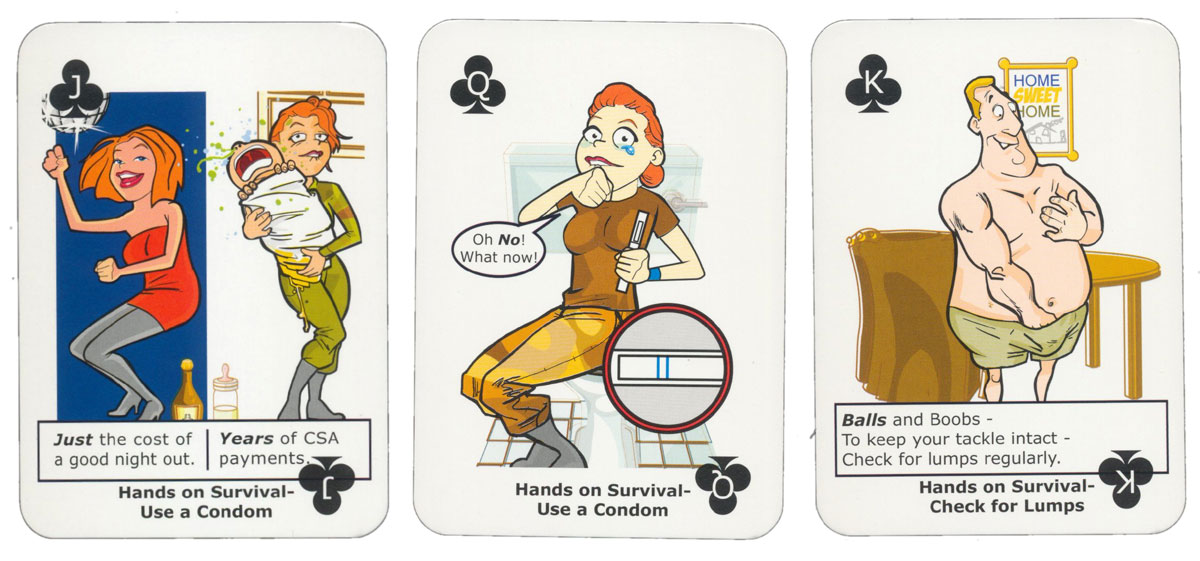 Issued by the British Army in 2011, this deck of playing cards was handed out to recruits. It contains 52 cards divided into hearts, clubs, diamonds and spades, each with a different cartoon about army life, involving humour about masculinity, drinking or drug awareness, but also imparting a health message such as “Hands on Survival - Check for Lumps”, “Fit to Fight” and “Don’t be your own worst enemy!” Packs come with two jokers bearing information on where to get health advice and help. The cards are in the style of American ‘Stag Party’ pin-up decks from the 1950s with naughty or suggestive cartoons for men only, often involving doctors, nurses and honeymooners.