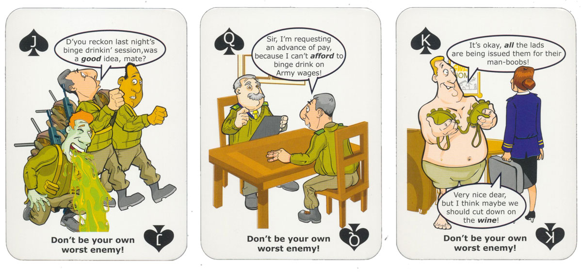 Health Promotion playing cards issued by the British Army with cartoons about army life and information on where to get health advice.