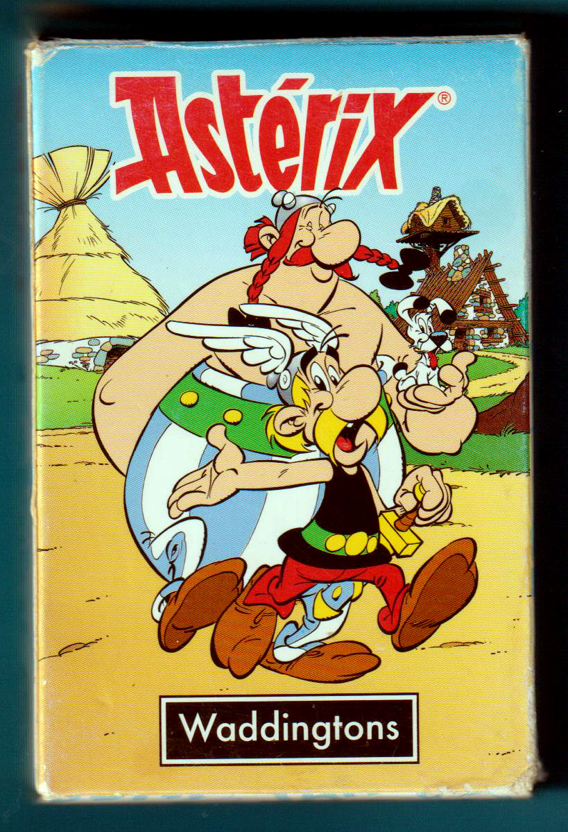 How strange to find a quintessentially British brand name – Waddingtons – on a pack for the French market featuring Astérix the Gaul! René Goscinny and Albert Uderzo’s much-loved and ever-popular creation appears alongside other familiar but unnamed characters, although Astérix and Obélix have been relegated to two of the Jacks, with Idéfix as one of the Jokers. A paint effect has been employed to add background colour to the Aces, resulting in an absence of colour for the suit-signs on these cards. The indices are small and in French, with frames surrounding those on the numeral cards. Sadly, as so often with packs from this publisher, a see-through board has been used, no doubt reducing the cost of production. • See the box