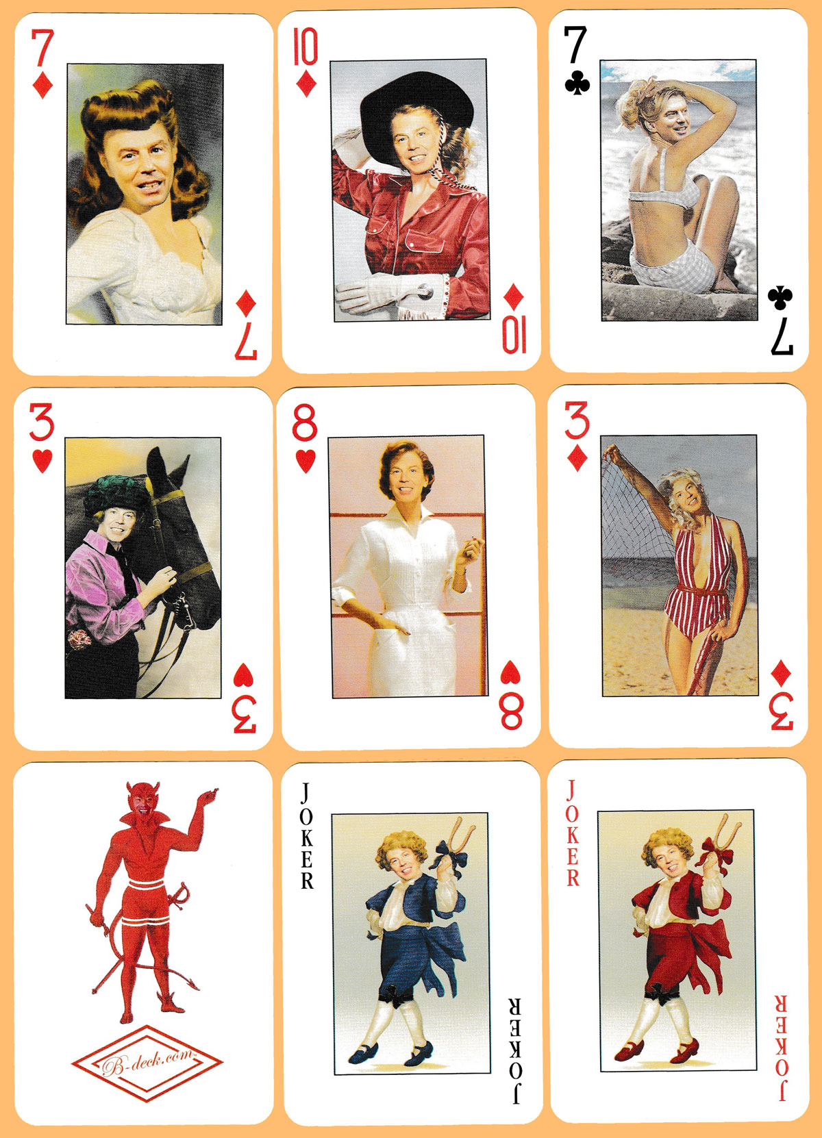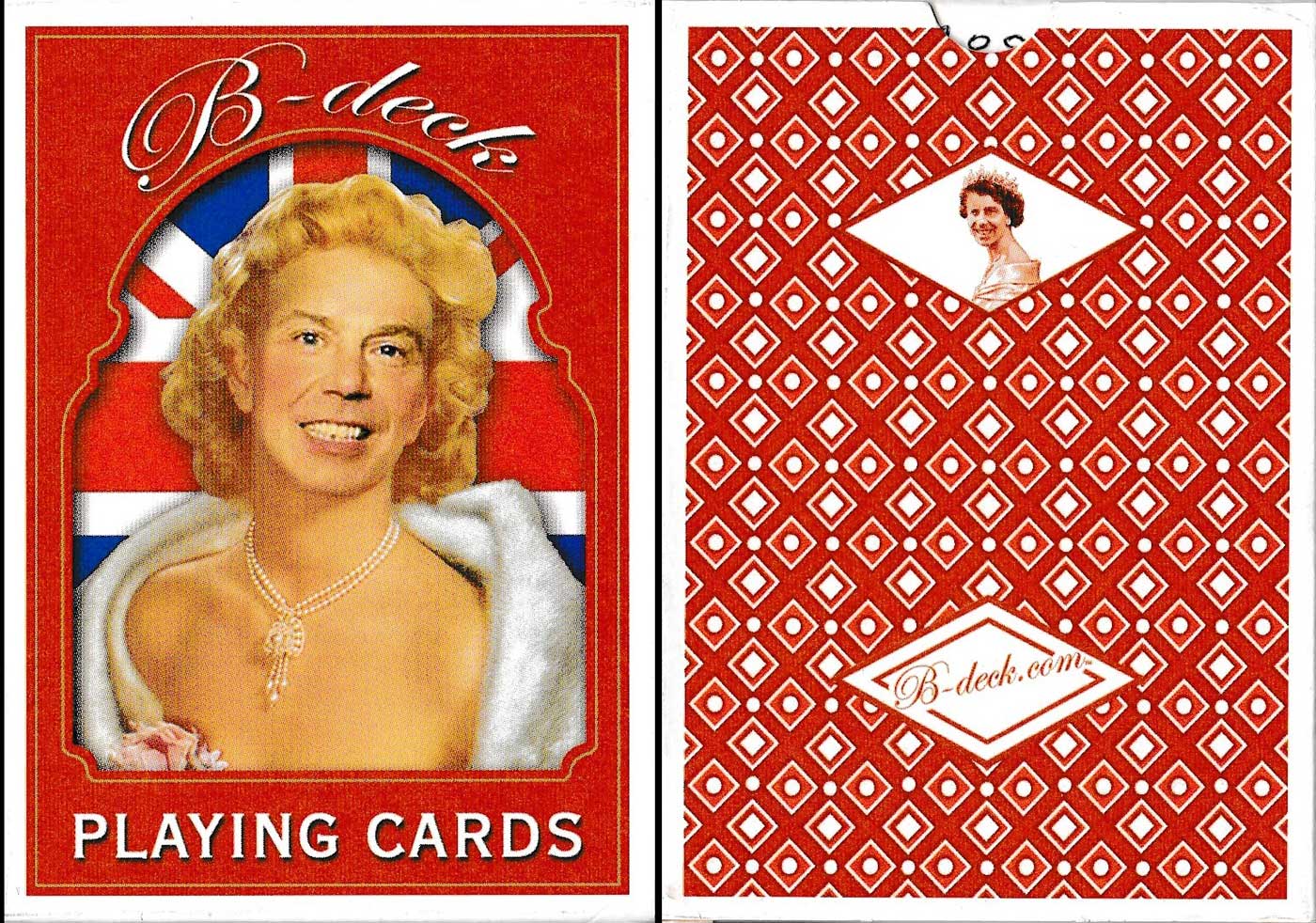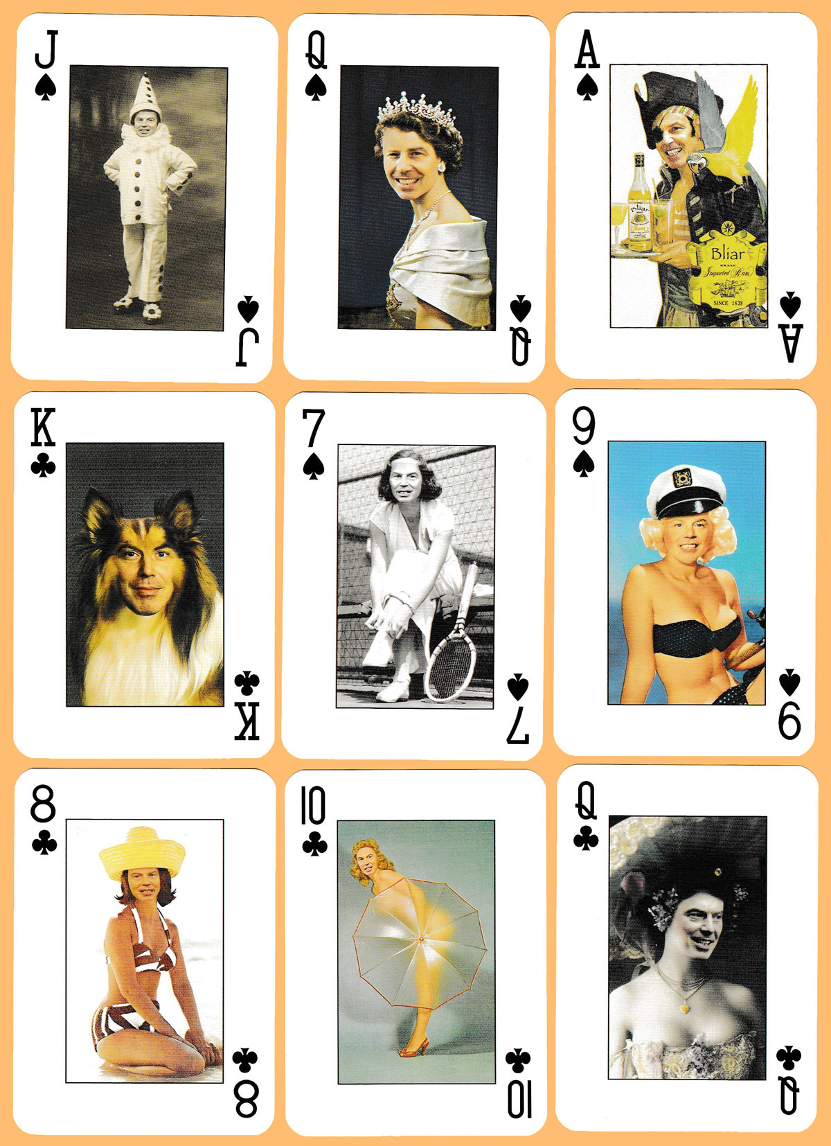 This pack was published at or around the same time as the W Deck, c. 2004. While the W Deck cards poke fun at President George W. Bush, this is effectively the British equivalent. The B-deck similarly superimposes the face of Tony Blair, UK Prime Minister (1997-2007) on a multitude of different, scurrilously inappropriate and often glamour photographs on each of the 54 cards. Among the representations Blair is shown as a clown, glamour model, bathing beauty, baby, various Hollywood actresses, Queen Elizabeth and many others. On the ace of spades his name is purposely misspelt as Bliar – a reference to the Blair’s claims that Saddam Hussein had developed weapons of mass destruction and had ties with al-Qaeda. The pack was printed by Carta Mundi. See the box►