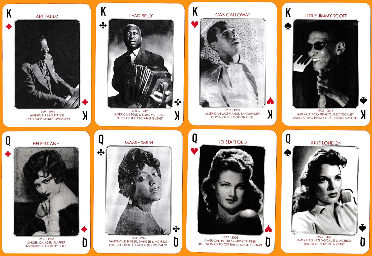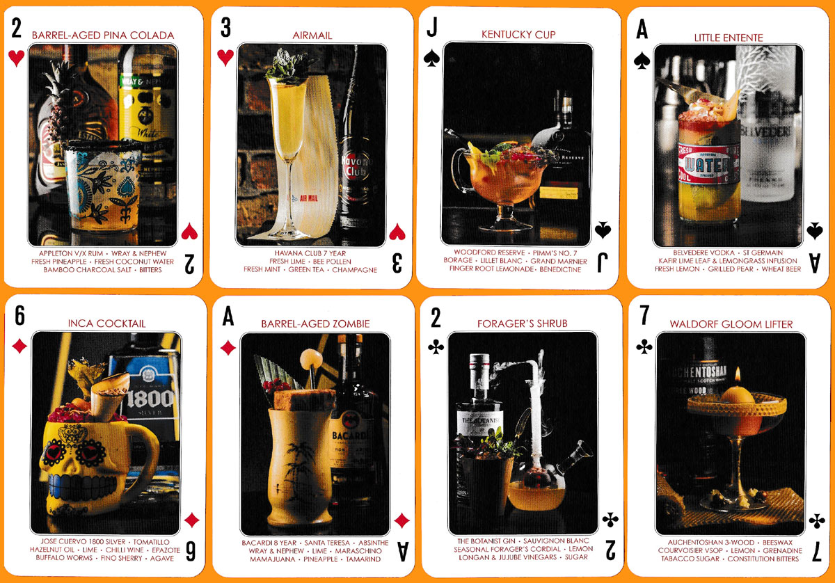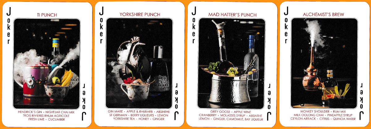Nightjar in Shoreditch, London was conceived as an antidote to overcrowded West End bars and flashy nightclubs, and claims to be a destination for discerning drinkers to meet, linger and relax, offering quality cocktails, good food, and a varied live music programme. The aces and pip cards, together with the Jacks and the four Jokers, display a modern named cocktail together with details of the ingredients. The Queens and Kings show black-and-white photos of early jazz and blues vocalists. See the box►
