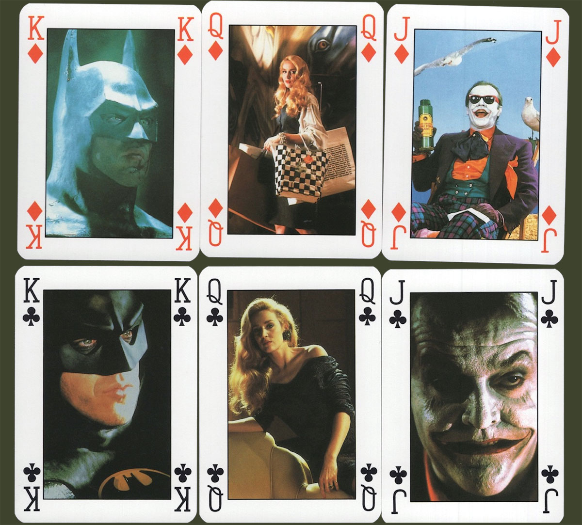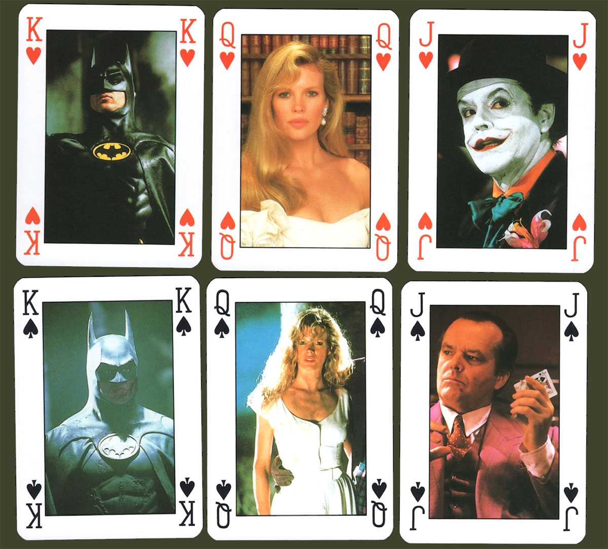 Now a vintage collectible item, these Batman playing cards inspired by the iconic film were published by InterCol of London in 1989. The cards feature Michael Keaton as Batman on the kings, Kim Bassinger as Vickie Vale on the queens and Jack Nicholson as the Joker on the jacks. The aces have reversible pictures from the film, most depicting Bat vehicles. The jokers have reversible photos of the main characters. The reverse of the cards is the Batman logo