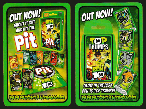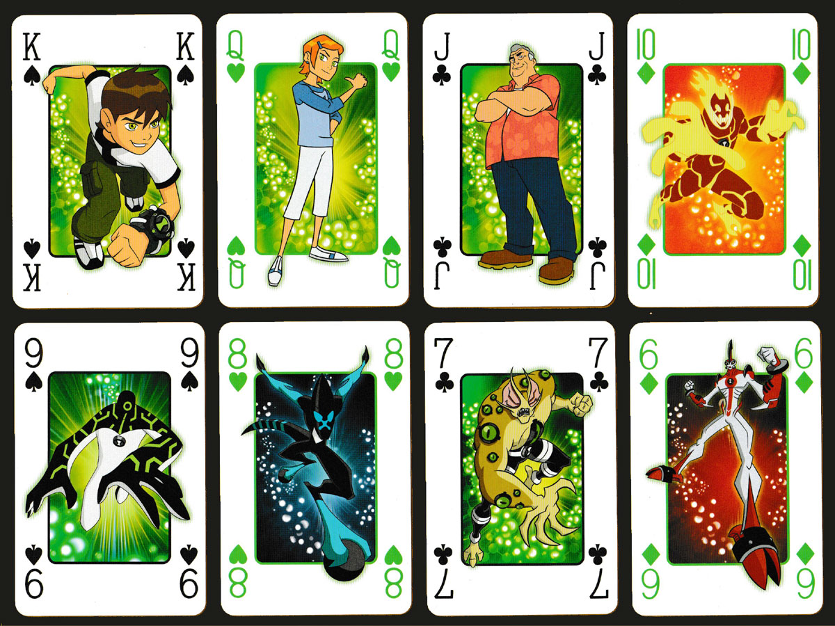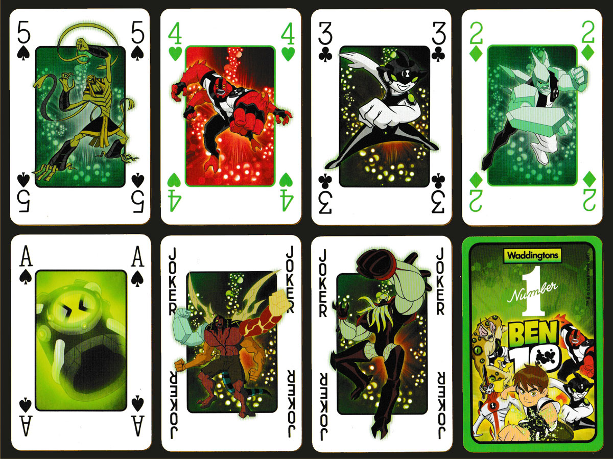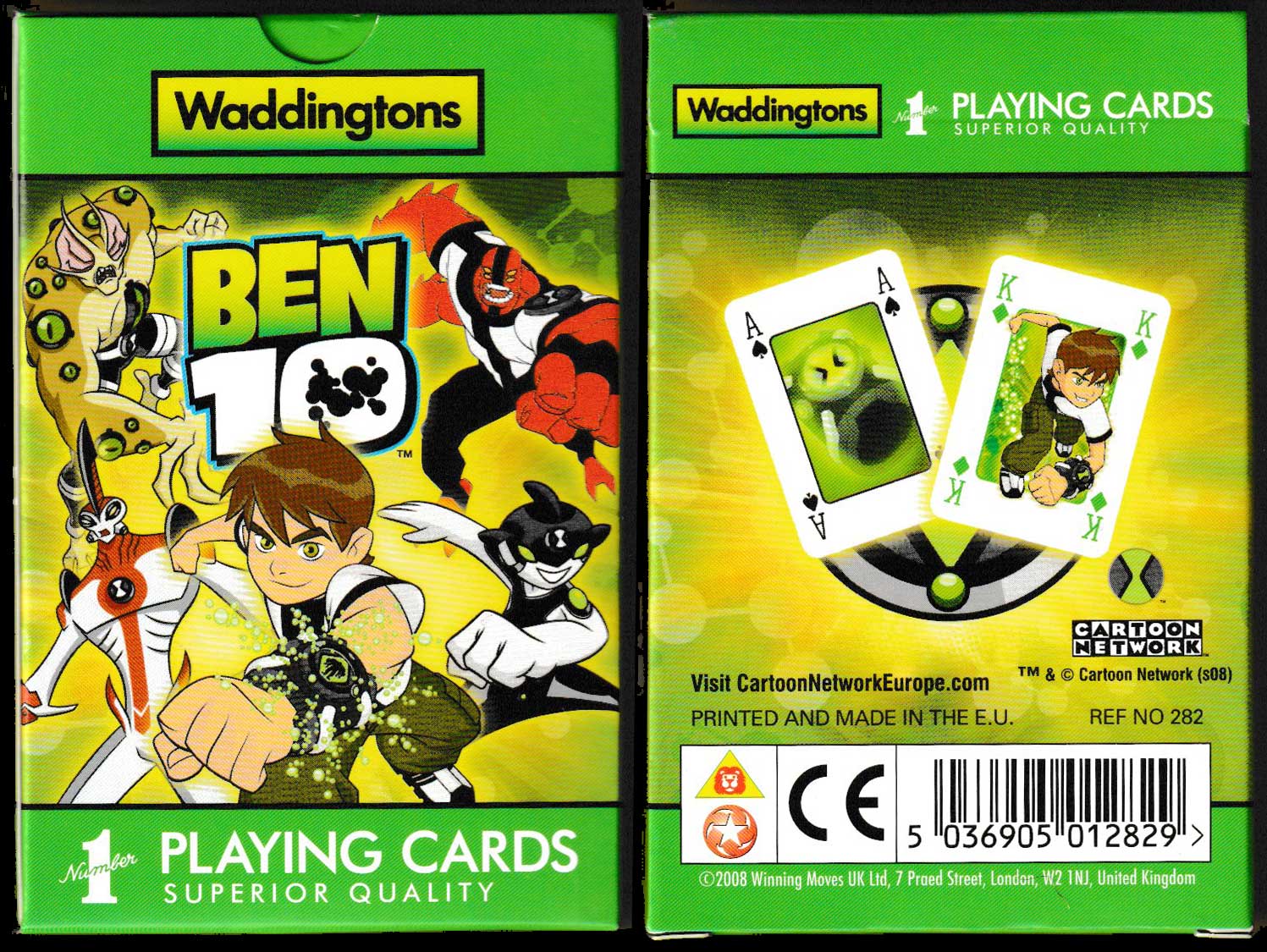 Ben 10 is an animated television series about a 10-year-old boy named Ben Tennyson, who acquires a watch-style alien device called the “Omnitrix”. The show was created by Man of Action for Cartoon Network. Attached to his wrist, the watch allows Ben to transform into 10 different alien creatures with various different abilities, enabling him to fight evil from Earth and space with his cousin Gwen and grandfather Max. Ben, sporting his watch, appears on the Ks, while other characters are featured on the remaining cards (same designs in each suit). The red suit-signs and indices are printed in green, the predominant colour throughout the pack. The pack was published under the “Waddingtons Number 1” brand label.