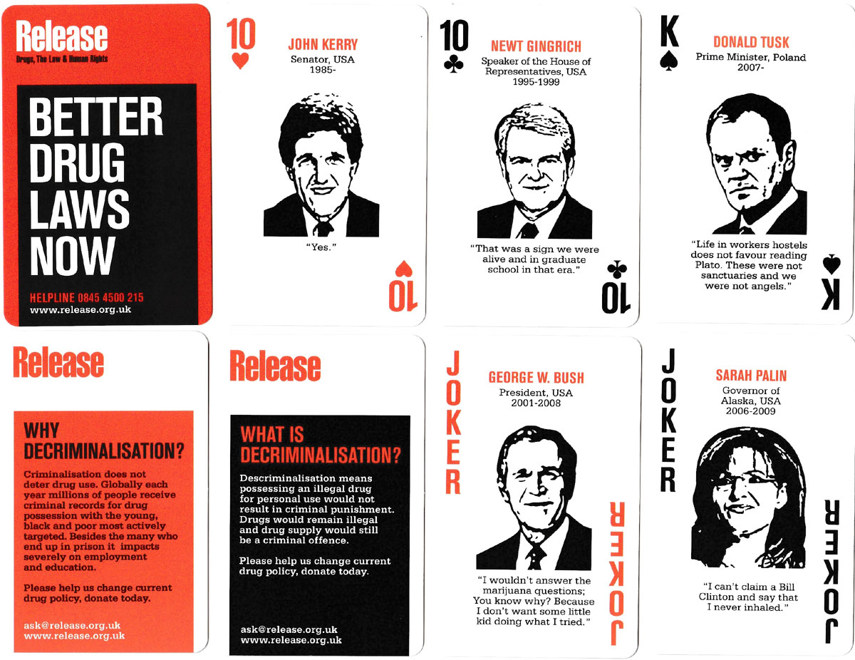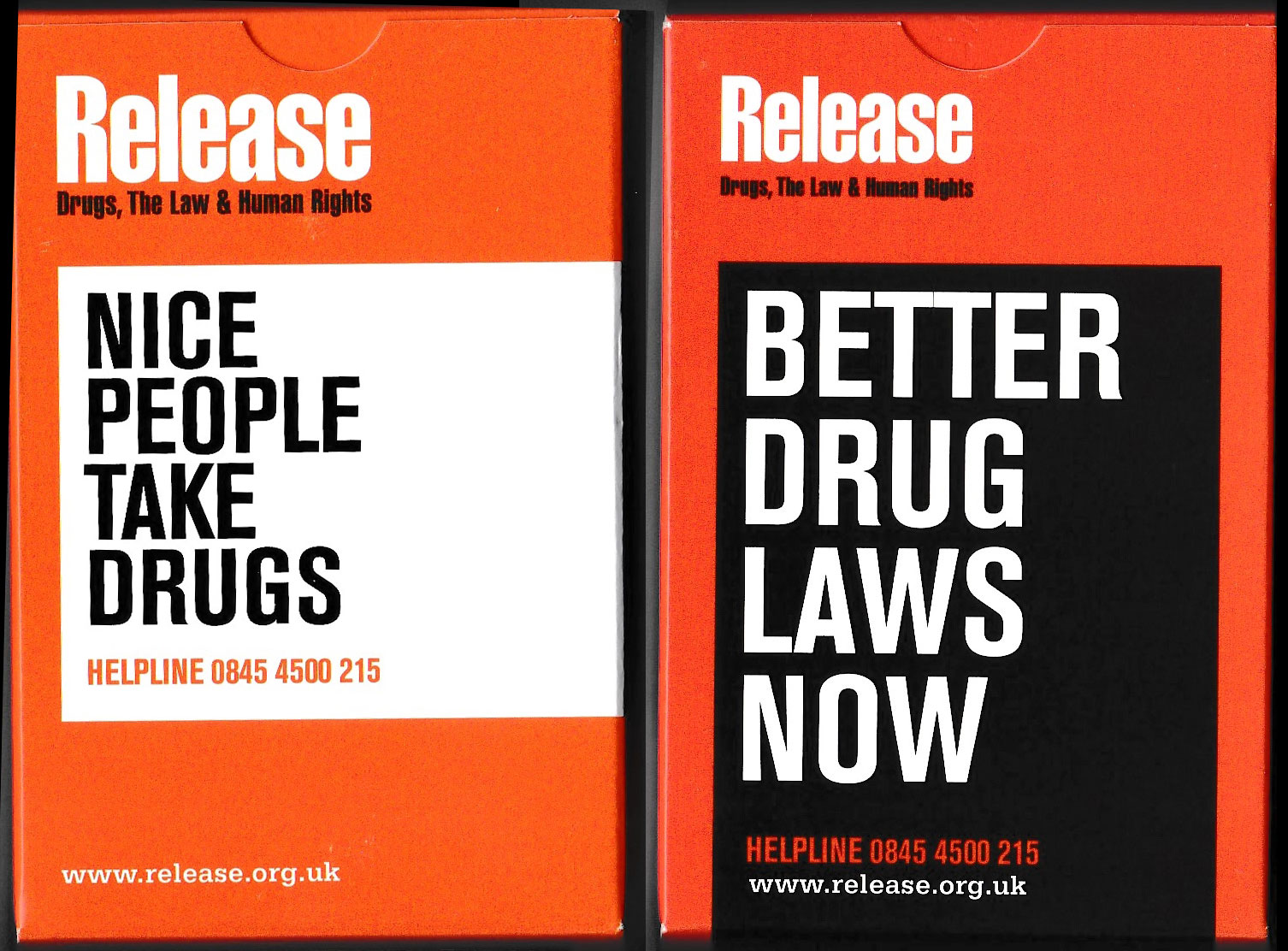 “Better drug laws now” campaign playing cards issued by Release, United Kingdom.