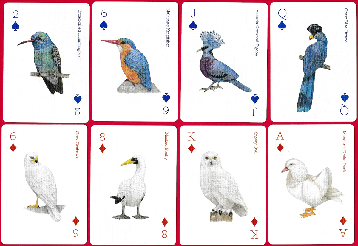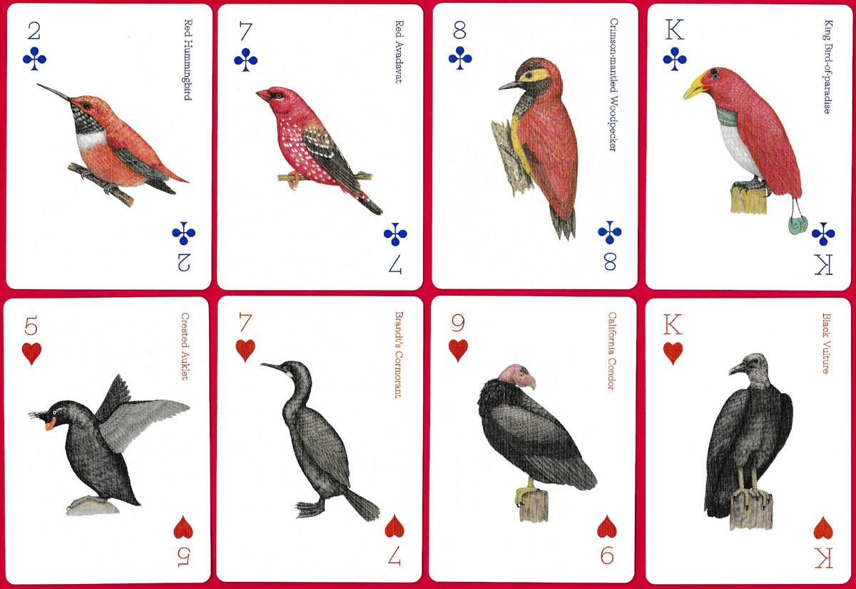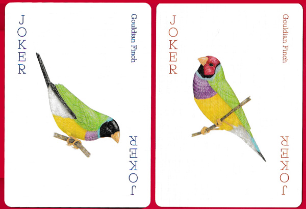 Above: Birds playing cards illustrated by Ryuto Miyake and produced by Laurence King Publishing Ltd, London, 2019. The two jokers present different views of a multi-coloured bird, the Gouldian Finch.