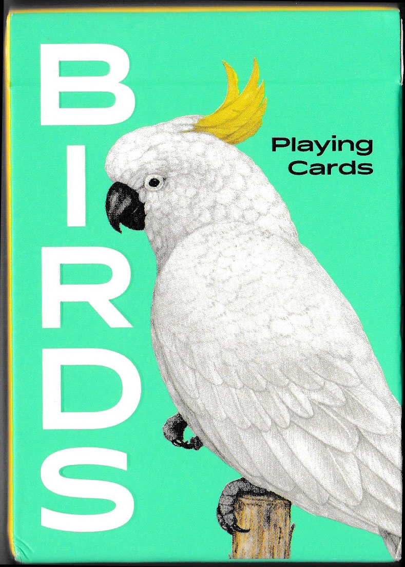 Produced by Laurence King Publishing Ltd., London in 2019 this pack displays 54 colourful birds illustrated by Ryuto Miyake. Each suit displays birds of a specific colour: black birds (hearts); red birds (clubs); white birds (diamonds) and blue birds (spades). The two jokers present different views of a multi-coloured bird, the Gouldian Finch. See the box►