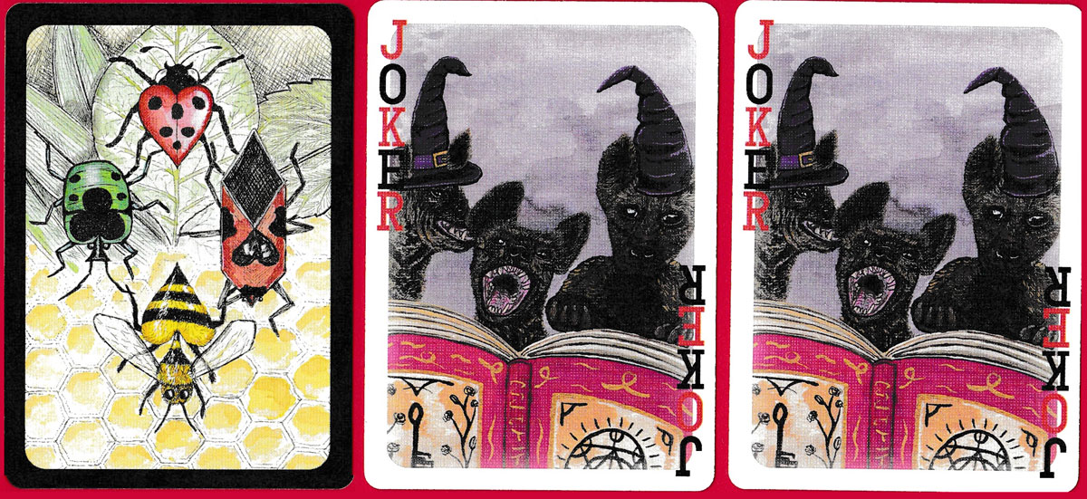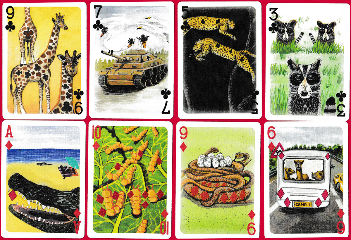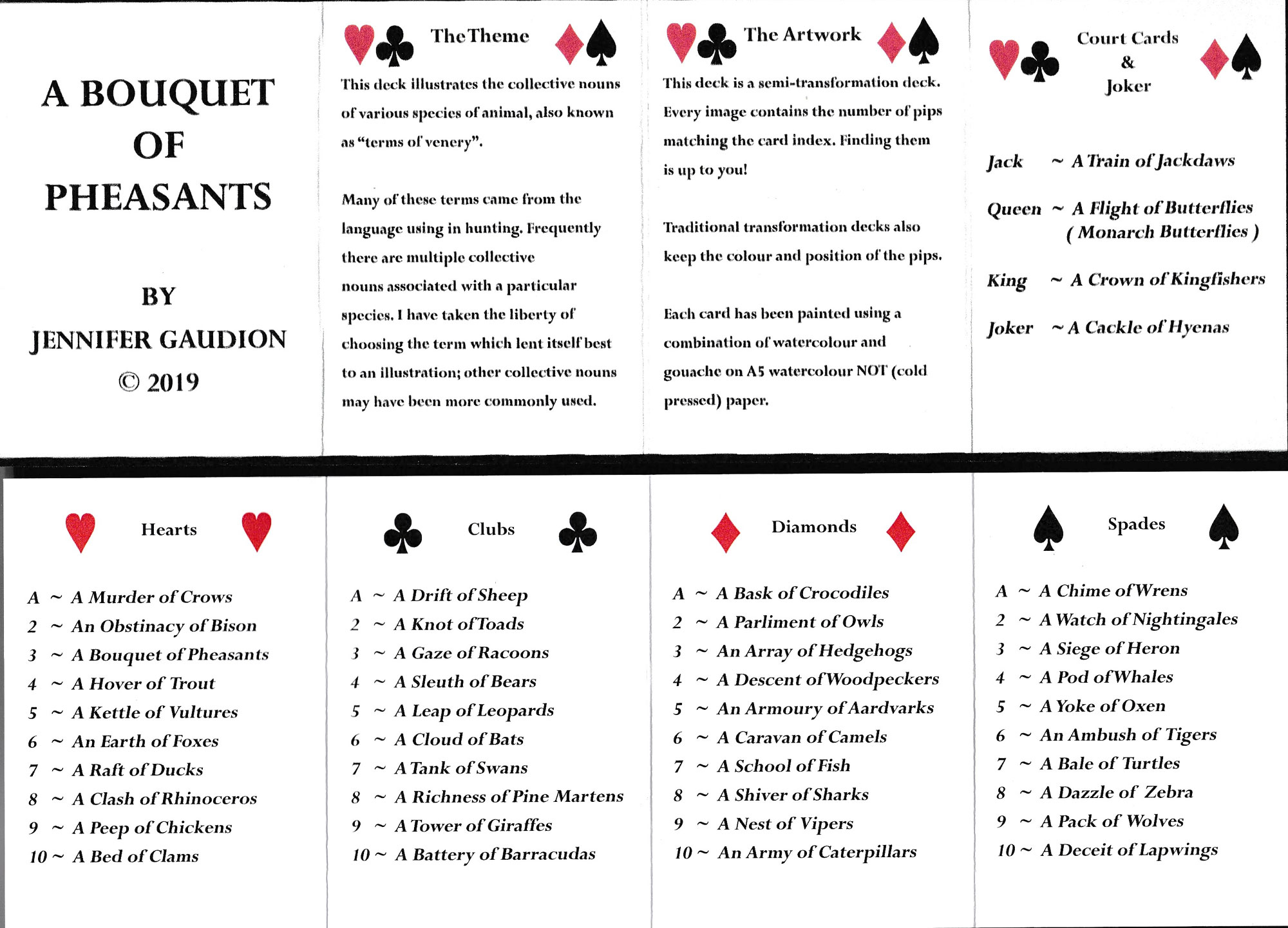 This is the third pack produced by artist Jennifer Gaudion. It is an imaginative and colourful semi-transformation pack illustrating animal collective nouns (also known as “terms of venery”) with 54 gouache paintings. The pack is accompanied by a leaflet providing information about the theme and the artwork, and also listing the content of each card (e.g. seven of clubs = a Tank of swans; eight of spades = a Dazzle of zebra). See the leaflet►