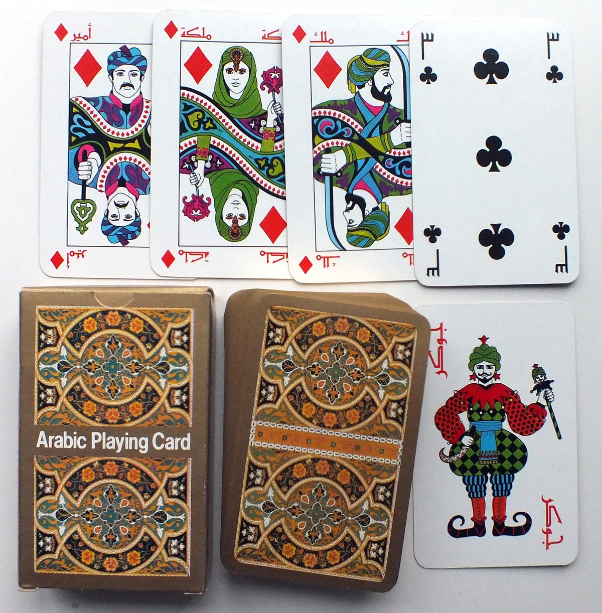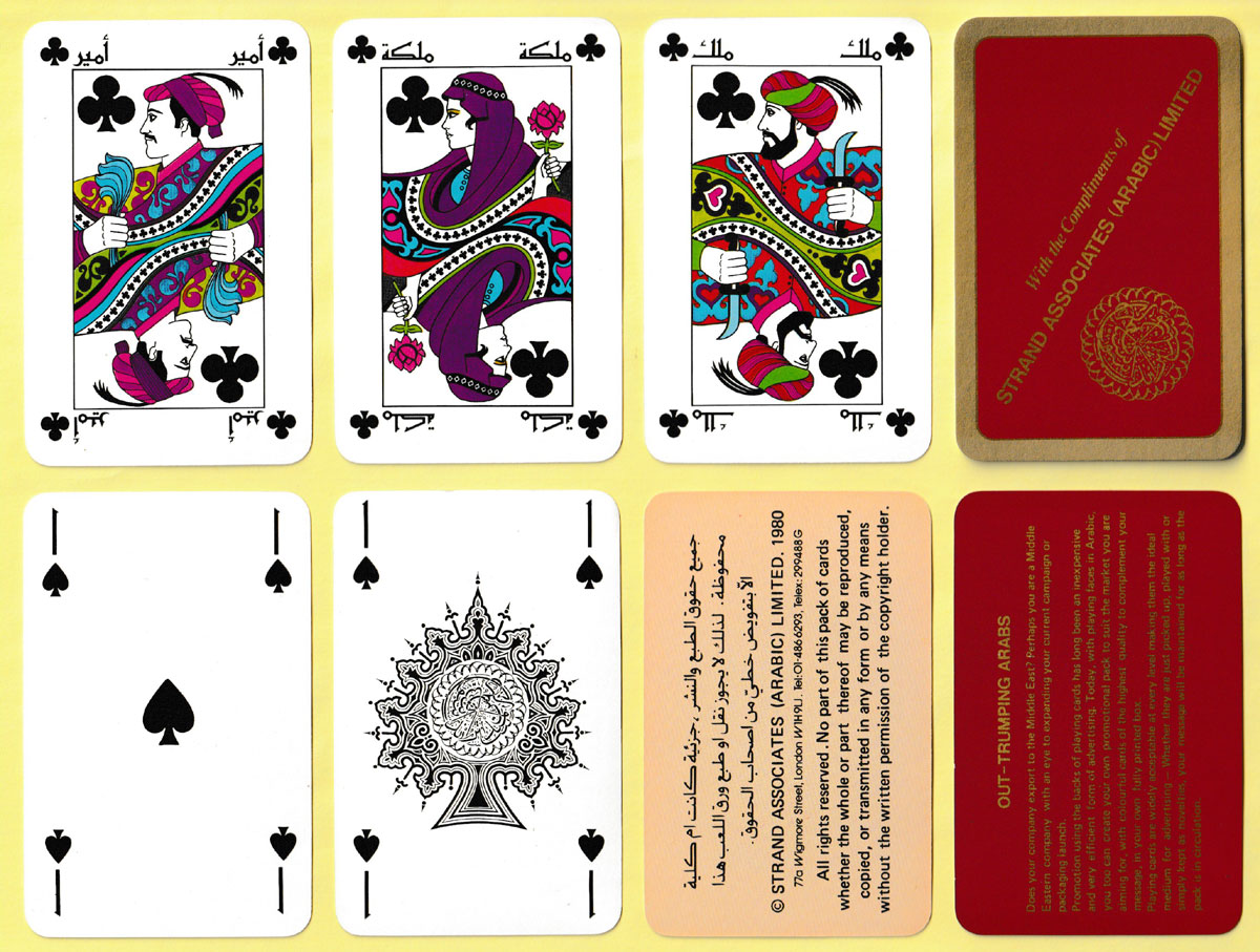 These original designs were inspired by the “One Thousand and One Nights” (Arabian Nights) folk tales, and are found in various editions as promotion for Strand Associates (Arabic) Limited, Sheraton Hotels Middle East, Arab Express Travel, and Al Mabani Construction Group (active in the Middle East, mainly in Saudi Arabia). The numerals are Arabic and the face cards are labelled in Arabic. King translates to "Malek," Queen to "Malekeh," and Jack to "Amir." The joker translates to "Joker."