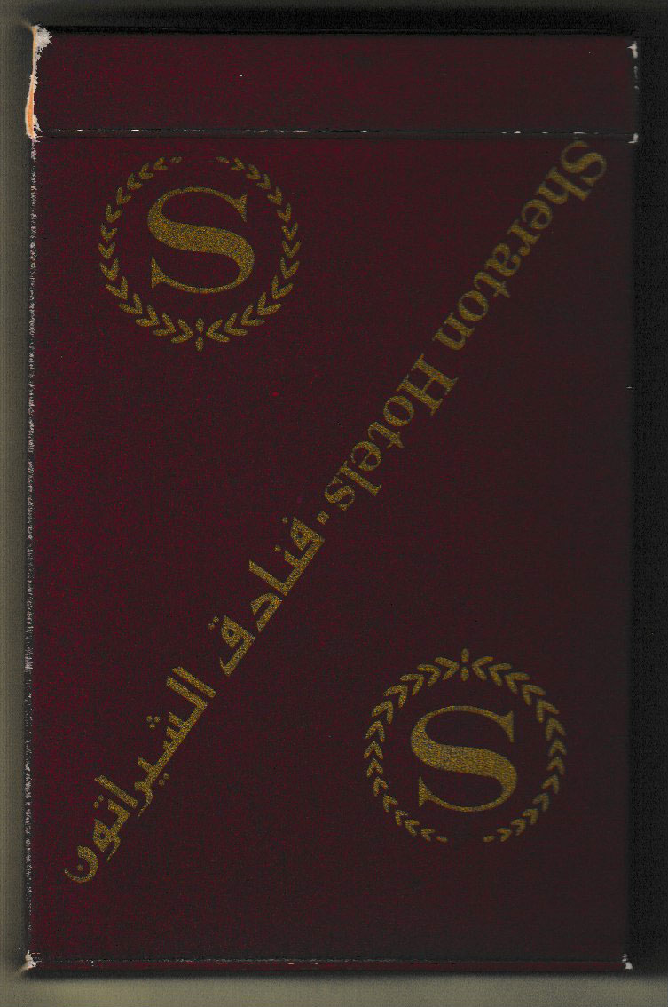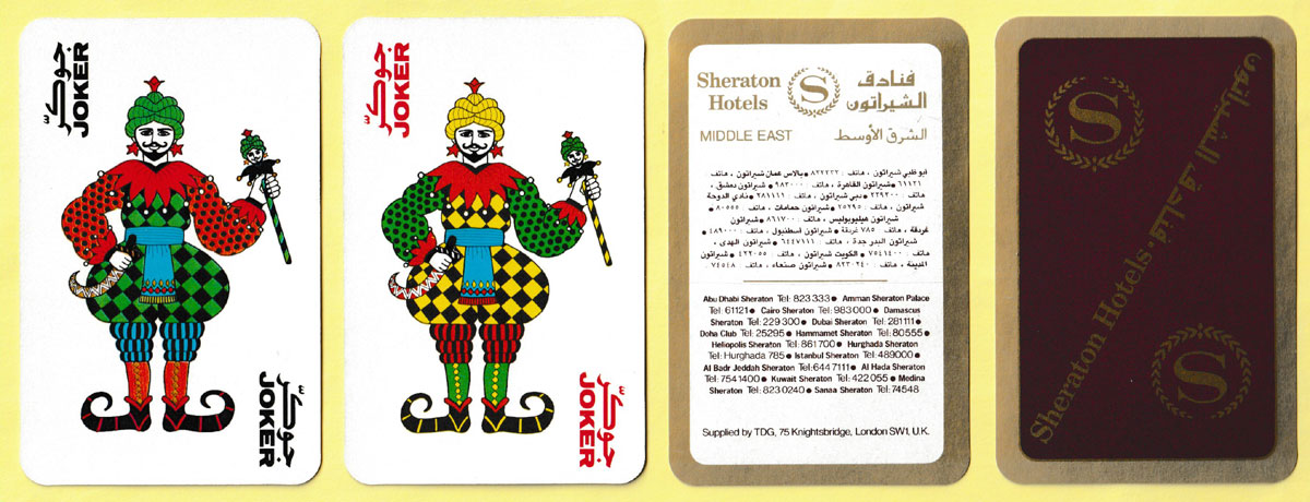 This edition has the same courts but is on thinner card. However, the indices are in English and Arabic on the court cards and Jokers, while the numeral cards have Arabic numbers but are not in Arabic script. The back carries a general advert for Sheraton Hotels. One side of the extra card remains as before (mentioning Strand Associates (Arabic) Limited. 1980) while the other side has a general list of Sheraton Hotels in the Middle East. I have no idea who printed this version. See the box►