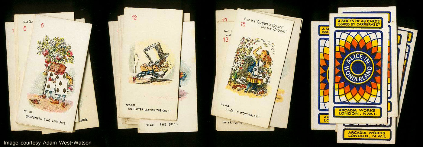 Carreras issued a number of packs of advertising playing cards, cigarette and trade cards, card games, miniature playing cards, dominoes, fortune telling cards, Alice in Wonderland and Happy Family cards during the 1920s and 30s.