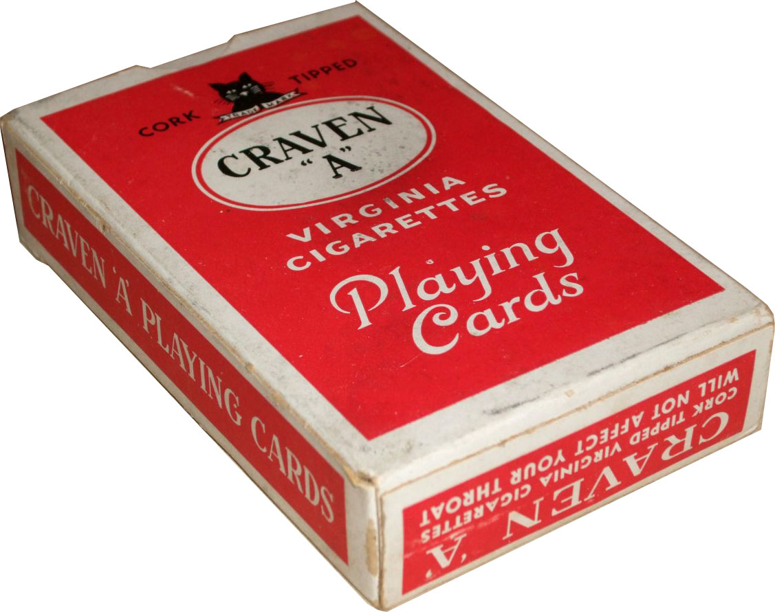 Above: deck advertising Craven ‘A’ Cigarettes by De La Rue, 52 cards + 1 joker in box, mid-to-late 1940s. Image courtesy Matt Probert.