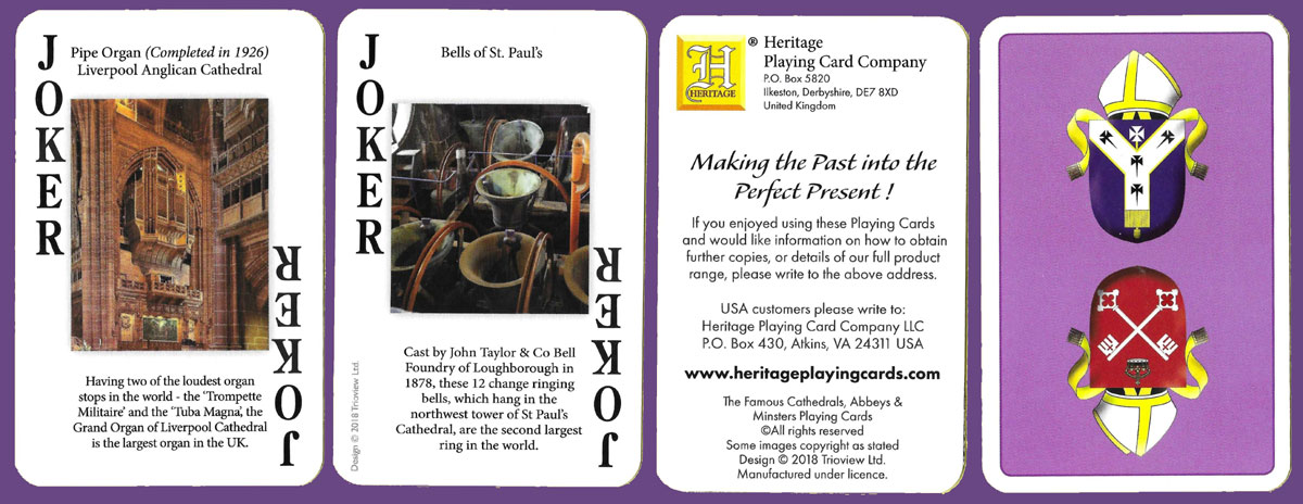 This pack, produced by the Heritage Playing Card Company in 2018, presents 54 pictures of different famous cathedrals, abbeys and minsters. The majority of those represented are located in England, though six Welsh cathedrals are also included. No information is provided other than the name of each edifice above the photograph, with the location shown below. The back of each card depicts the coat-of-arms of the Archbishop of Westminster and the Archbishop of York. There are two jokers: one shows the bells of St. Paul’s Cathedral and the other the pipe organ of Liverpool Anglican Cathedral. Completing the pack is an extra card advertising the Heritage Playing Card Company • See the box