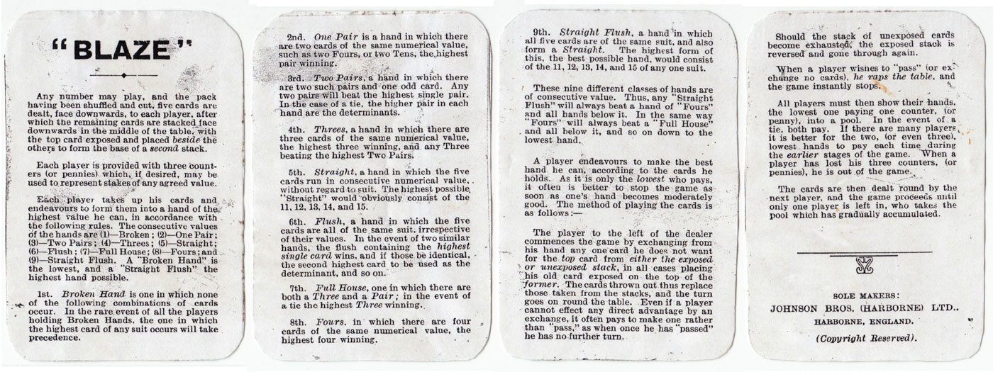“Blaze” card game was manufactured by Johnson Bros/Chad Valley and introduced just before Johnson Bros changed their name to Chad Valley Ltd, as they moved into their new premises in the valley of the river Chad, c.1920. See the Rules► See the Box►