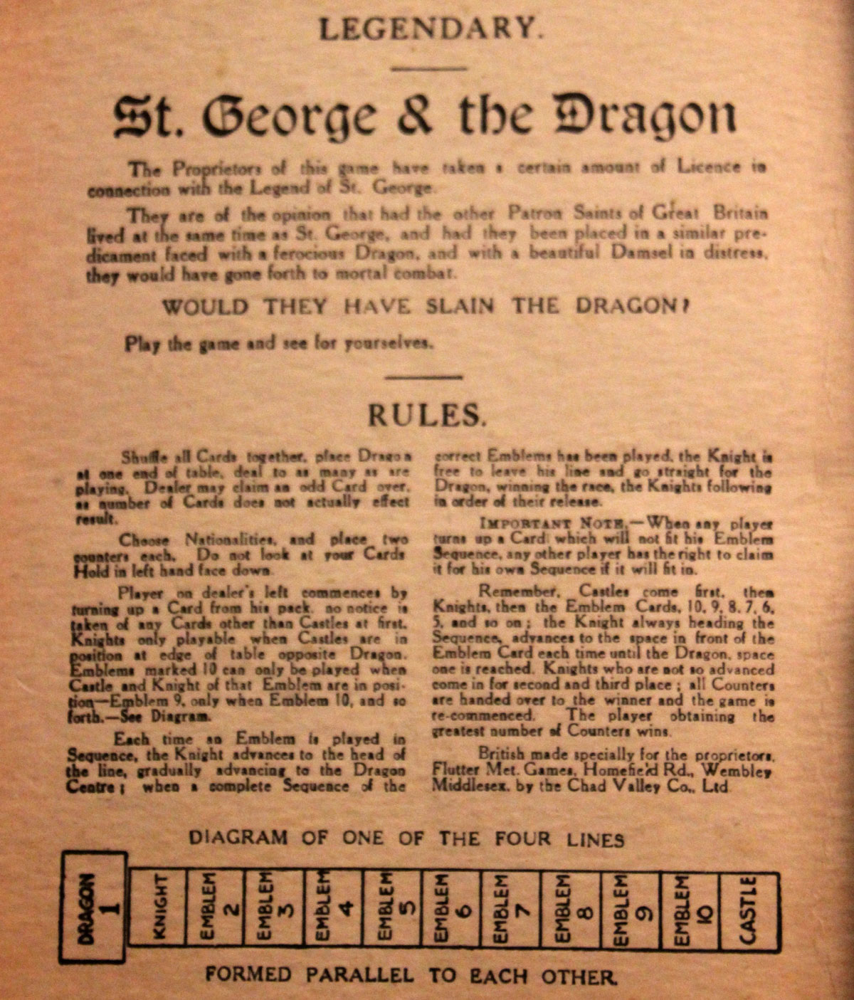 Chad Valley produced the games for Flutter Met Games of 6 Homefield Road, Wembley, Middx in the 1930s. The game involves choosing a nationality and a patron saint, and then playing to arrange castles, knights and emblems in sequence, aiming to kill the dragon before any opponent... see the rules→