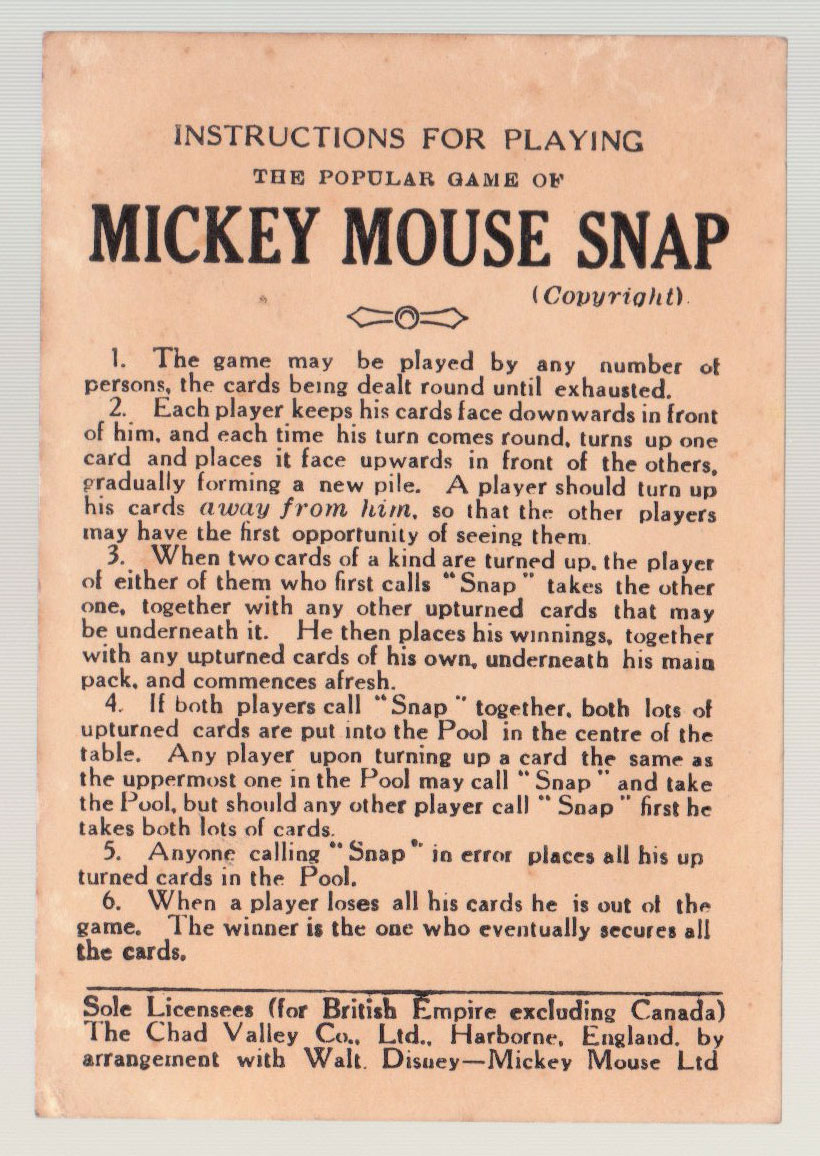 Above: “Silly Symphony” or “Mickey Mouse Snap” manufactured by Chad Valley Co. Ltd, 1930s, by arrangement with Walt Disney - Mickey Mouse Ltd. 40 cards + instructions card in box. A later edition was published with rounded corners.