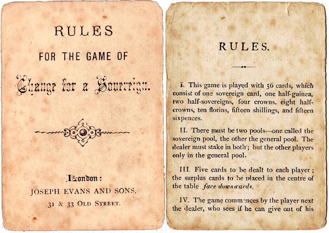 Above: Change for a Sovereign card game published by Joseph Evans & Sons, 114-116 Newgate St, London, and printed by Kronheim & Co London. 56 card pack, the numbers of each card value in the pack are listed on the rules card.
