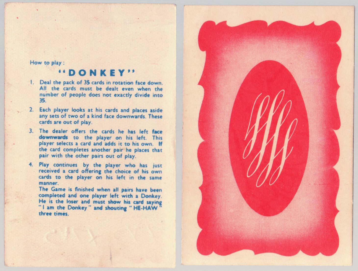 Donkey card game by Chiefton Products Ltd of Bristol, c.1950s. The illustrations are cheerful caricatures of farmyard animals, two of which are smoking tobacco products. Players aim to match sets of two of a kind and set them aside. The game ends when one player is holding the single donkey card, and they are the loser. See the Rules►