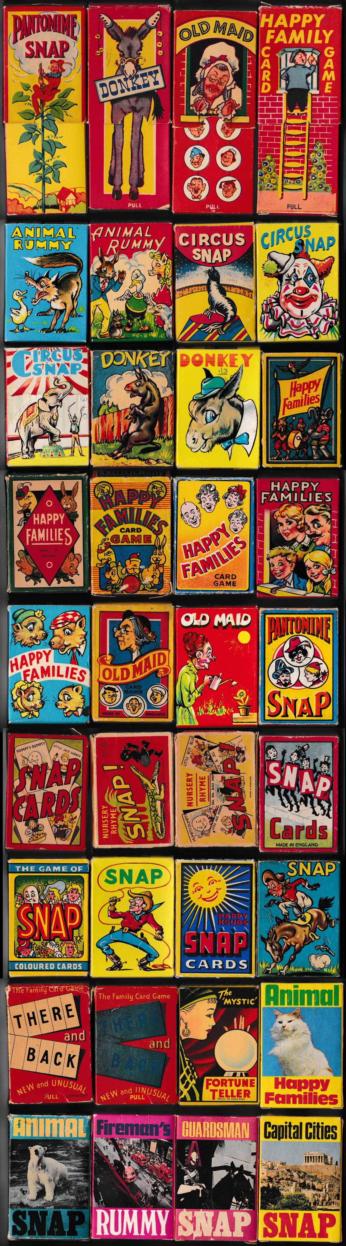 During this period Clifford card games appeared in several editions of 16 different games, including: Animal Rummy, Circus Snap, Donkey (2 versions), Happy Families (3 versions + a miniature), Mystic Fortune Teller, Old Maid, Pantomime Snap, Happy Hours Snap, Nursery Rhyme Snap, Wild West Snap & There and Back.