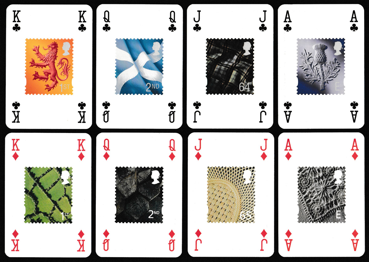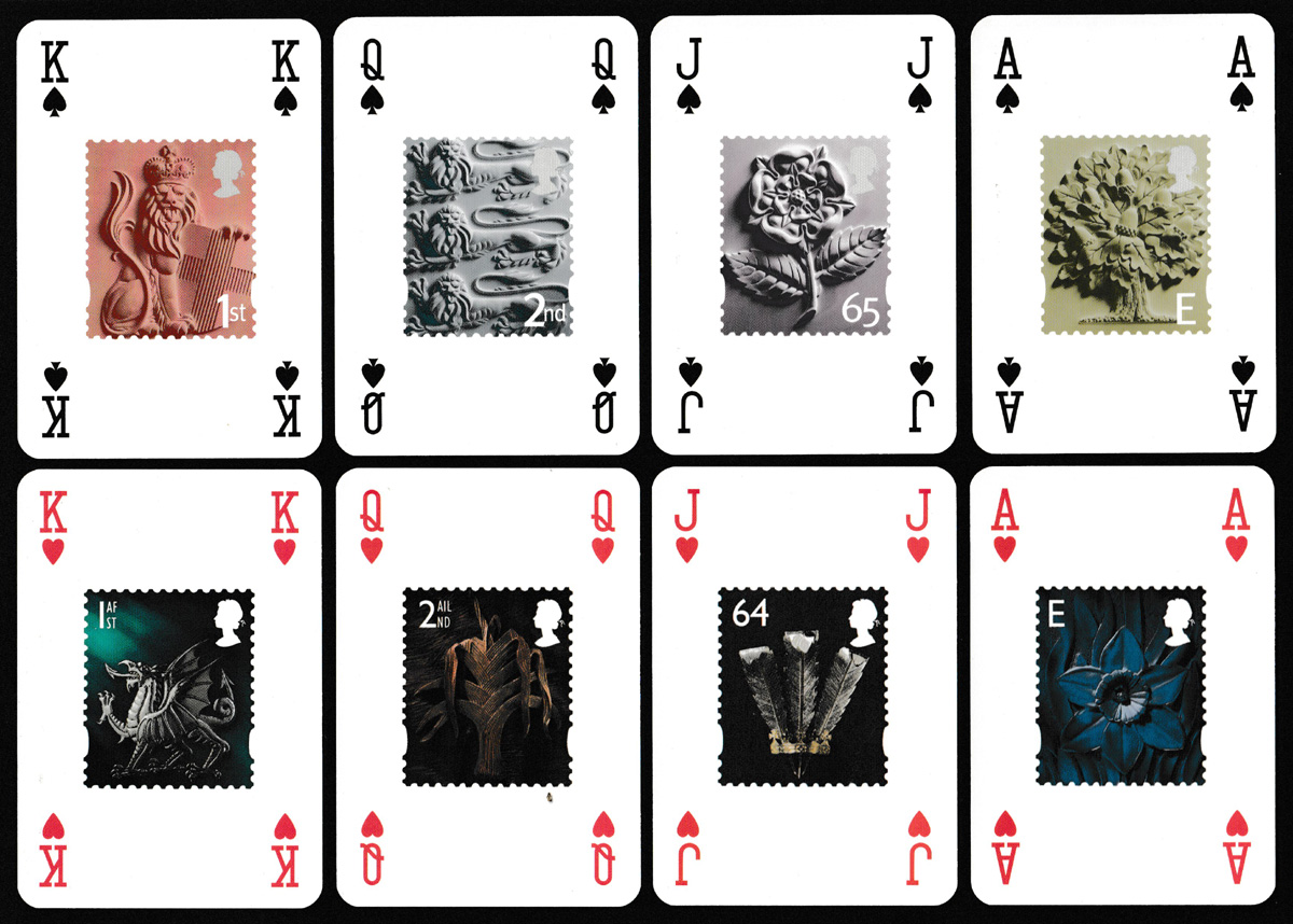 Regional stamps (later called country definitive stamps) were introduced for Scotland, Wales and Northern Ireland as long ago as 1958. In 1999 it was decided that England too should have its own regional stamps. Conveniently, that now made four regions each with their own stamps, one for each of the four suits. New designs were created, as featured on the present set of cards. Individual stamps for England (S), Scotland (C), Wales (H), and Northern Ireland (D) are depicted on the court cards and Aces. Complete sets of four stamps for each respective country are displayed down the middle of the pip cards, with the Royal Mail coat of arms in the background. The Joker shows the four stamps in use for European destinations (“E”). A curious quirk or anomaly (or error?) is that the top-value stamp in the Scottish and Welsh sets is 64 pence, whereas the top-value stamp in the English and Northern Irish sets is 65 pence! True, postage rates were changing from 1999 to 2000; however, they have always been the same for all parts of the UK. See the box►