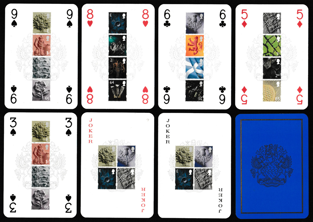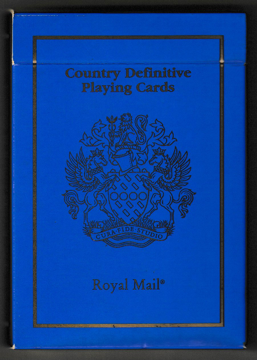 Above: Country Definitive Playing Cards printed by Carta Mundi for Royal Mail, c2000. 52 cards + 3 Jokers (2 red, 1 black) in tuck box. Size: 67 x 97 mm.