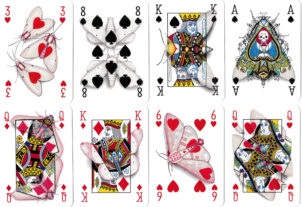 The Cryptic Cards pack was created by Immy Smith, an interdisciplinary artist interested in crypsis – that’s the ability of animals (and some plants) to avoid detection thanks to camouflage, mimicry, and other evolutionary strategies. The pack was produced in a limited edition of 900, and is a “sciart” project paying homage to the amazing cryptic camouflage found specifically in moths. The publication of the pack was successfully crowdfunded via Kickstarter and printed by Cartamundi UK. According to the information on the original Kickstarter site: “What would happen if, after thousands of years of evolution, moths developed cryptic patterns to camouflage themselves on human-made materials? Cryptic Cards is a year-long project in which artist Immy Smith is painting moths camouflaged into playing card designs as one answer to this question”. The pack consists of 56 cards, including 4 jokers, together with 2 of Immy Smith’s business cards.