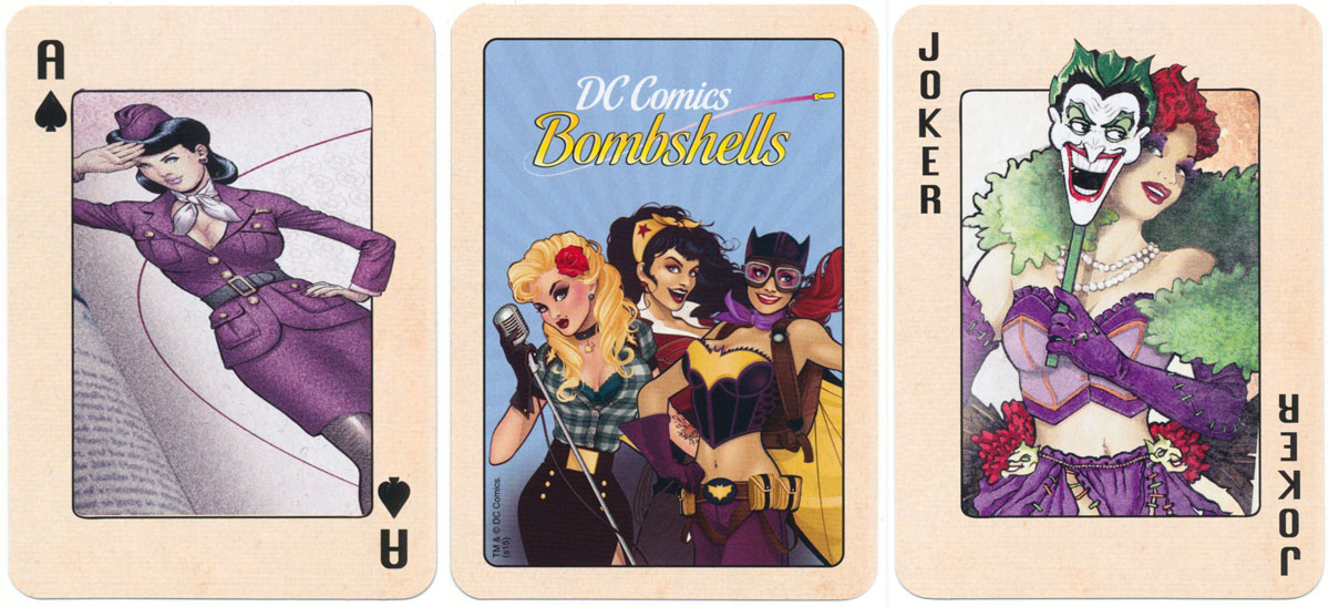 Stylish playing cards featuring the glamorous, superpowered female stars of the alternate reality world of DC Comics in a retro pin up look by US artist Ant Lucia, published by 'Forbidden Planet', 2015. See the box→