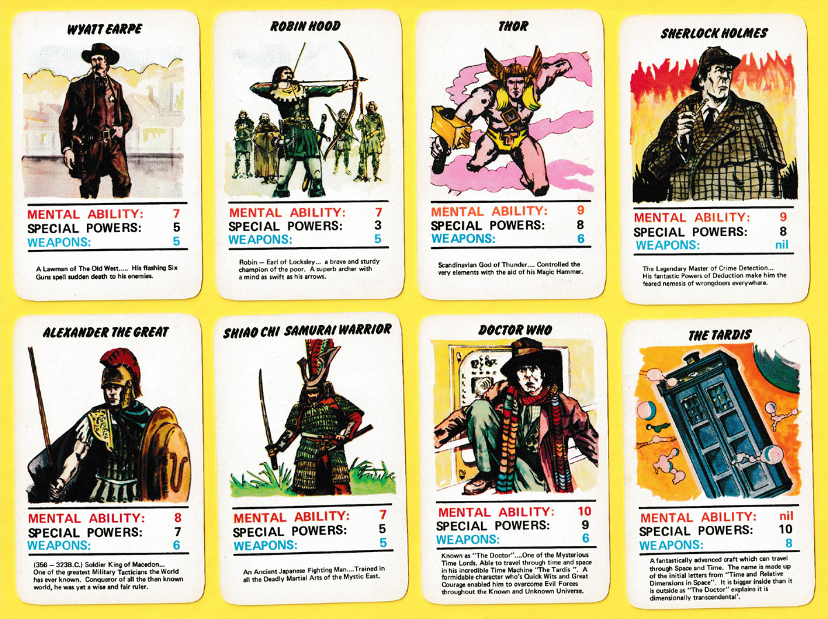 Issued in the middle of Tom Baker’s ‘reign’ as the Fourth Doctor (1974-1981), this is a card game of challenge for two players in which Doctor Who and the Legendary Legion of Earth’s past Heroes join battle with the Alien Hordes from deep space. The cards are divided into Heroes and Aliens (20 of each), with values allocated for Mental Ability, Special Powers and Weapons. Players challenge their opponents on one of these three criteria, with the higher value winning the ‘trick’.