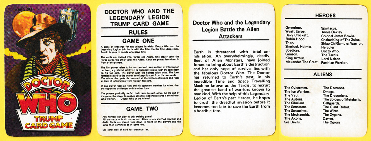 Above: Doctor Who Trump Card Game published by Jotastar, UK, 1978. Printed in Hong Kong. 40 cards + 2 extra cards in tuck box. Size: 58 x 89 mm. © BBC 1978