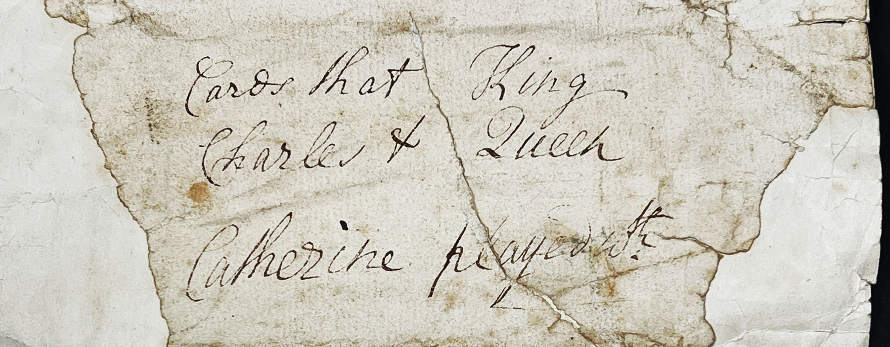 Above: a handwritten note stating that these cards were played with by King Charles II and Queen Catherine.