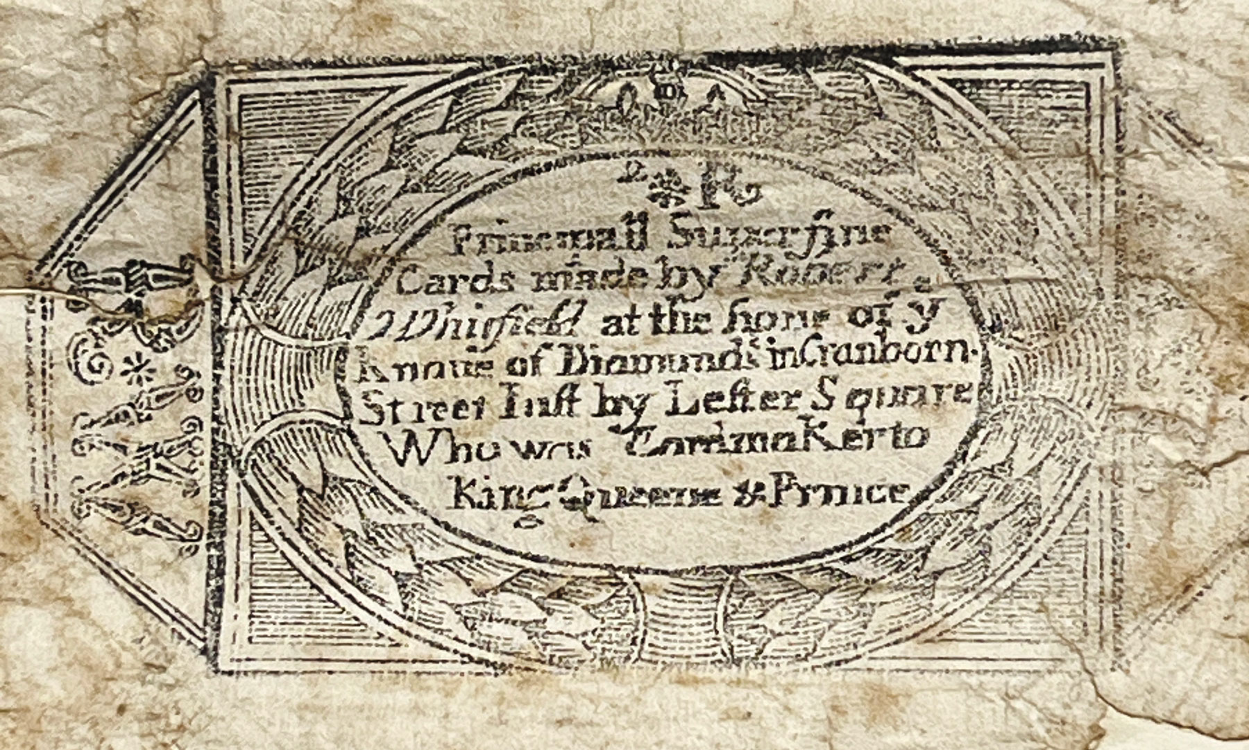 The wrapper gives the name of the maker as Robert Whitfield, who is recorded as Master of the Worshipful Company of Makers of Playing cards in 1671 and again from 1685-7. He was probably active from the late 1660s to around 1700. This is entirely consistent with our date estimate of ‘by 1676’ above.