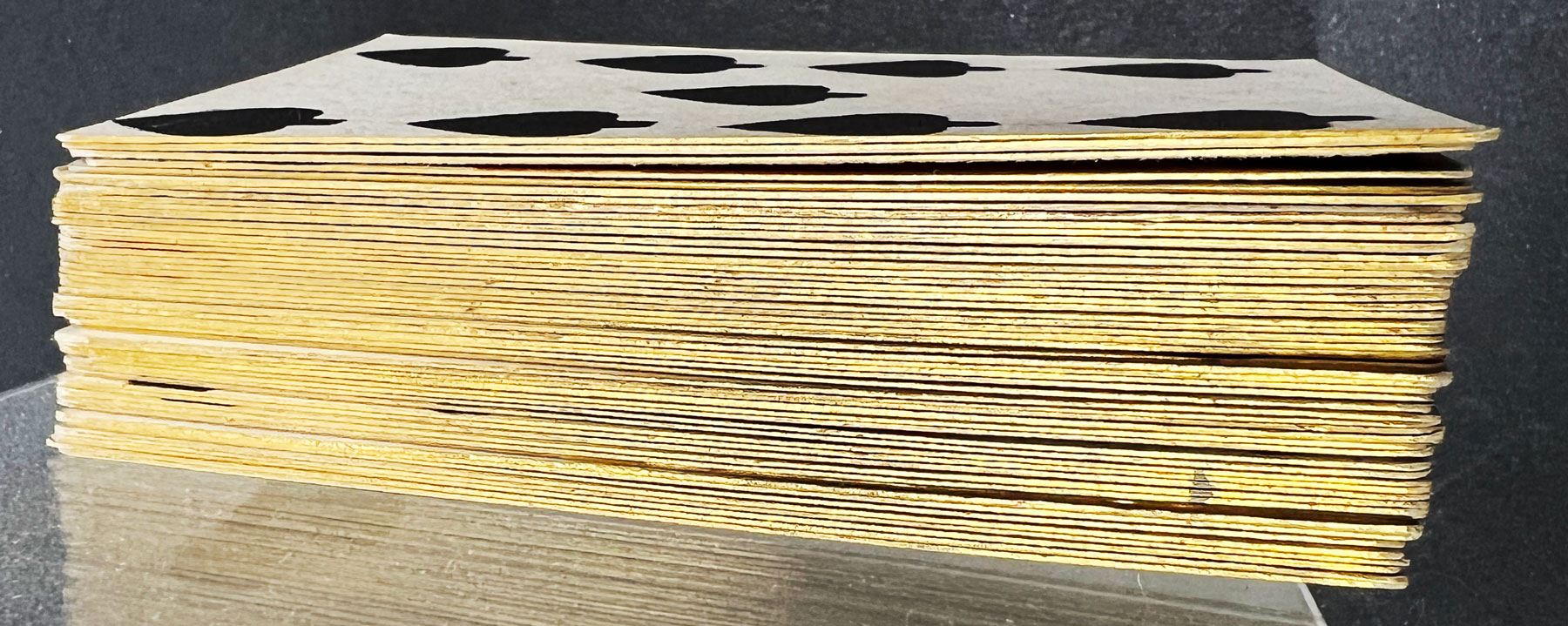 Above: side view of the historic pack of English playing cards, showcasing their gilded edges, indicative of high quality and craftsmanship.