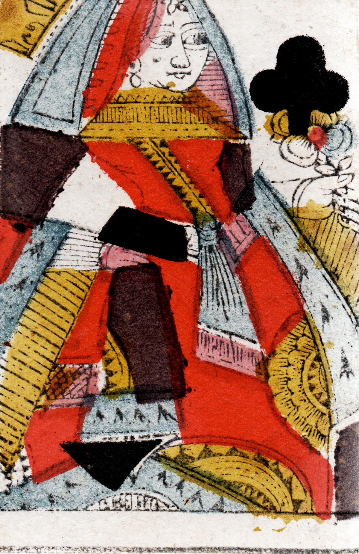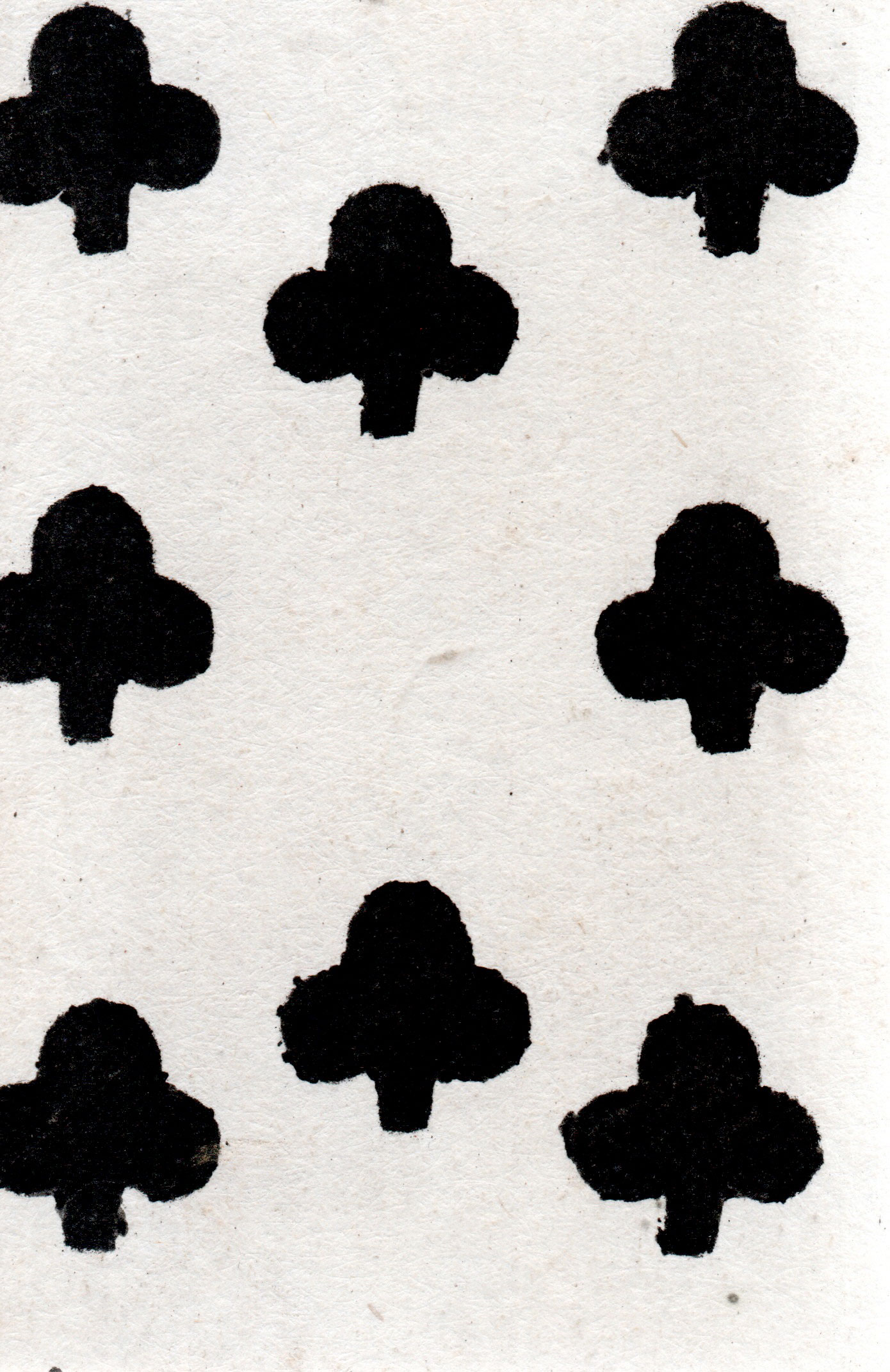Above: close-up of the unevenly printed clubs on a card from the historic 1675 English playing card pack, highlighting the characteristic design of the period.