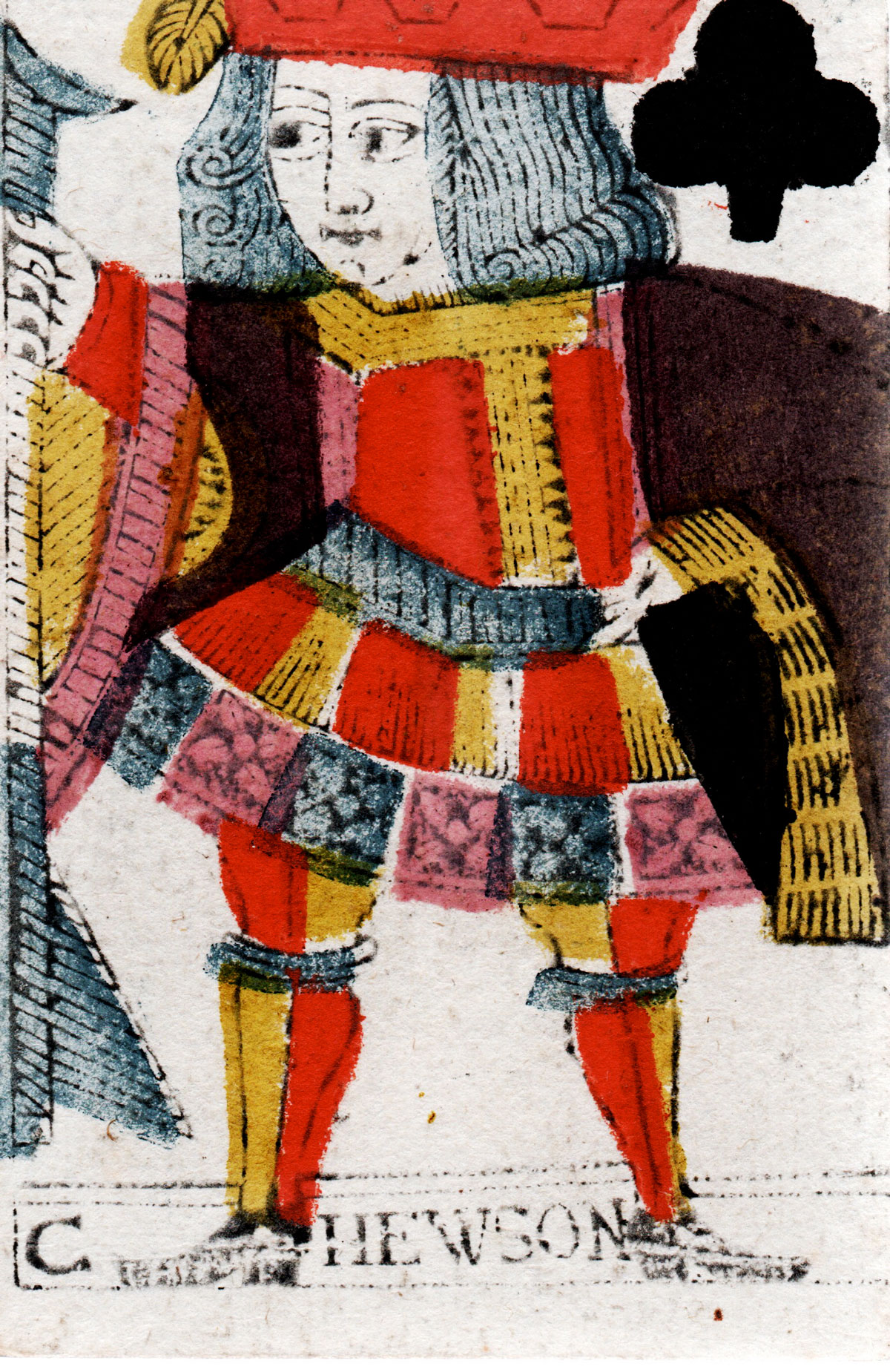 Above: close-up of the Jack of Clubs from the historic pack of English playing cards, featuring the name "C Hewson" at the bottom.