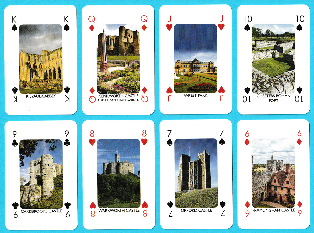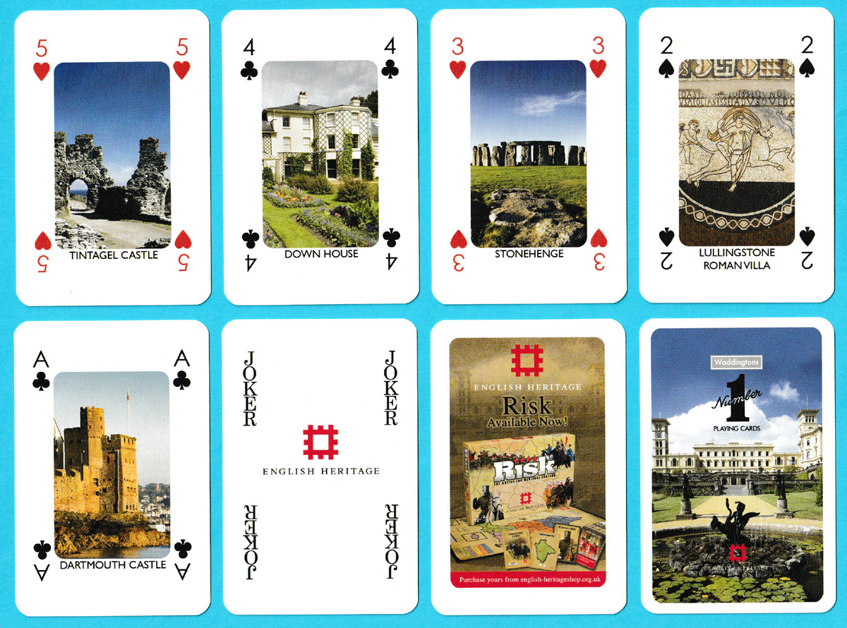 Above: English Heritage souvenir playing cards made by Trefl, Poland, for Winning Moves UK Ltd, London, UK, 2024. 52 cards + 2 (identical) Jokers + 1 extra card in tuck box. Size: 58 x 88 mm. © 2024 Winning Moves UK Limited.