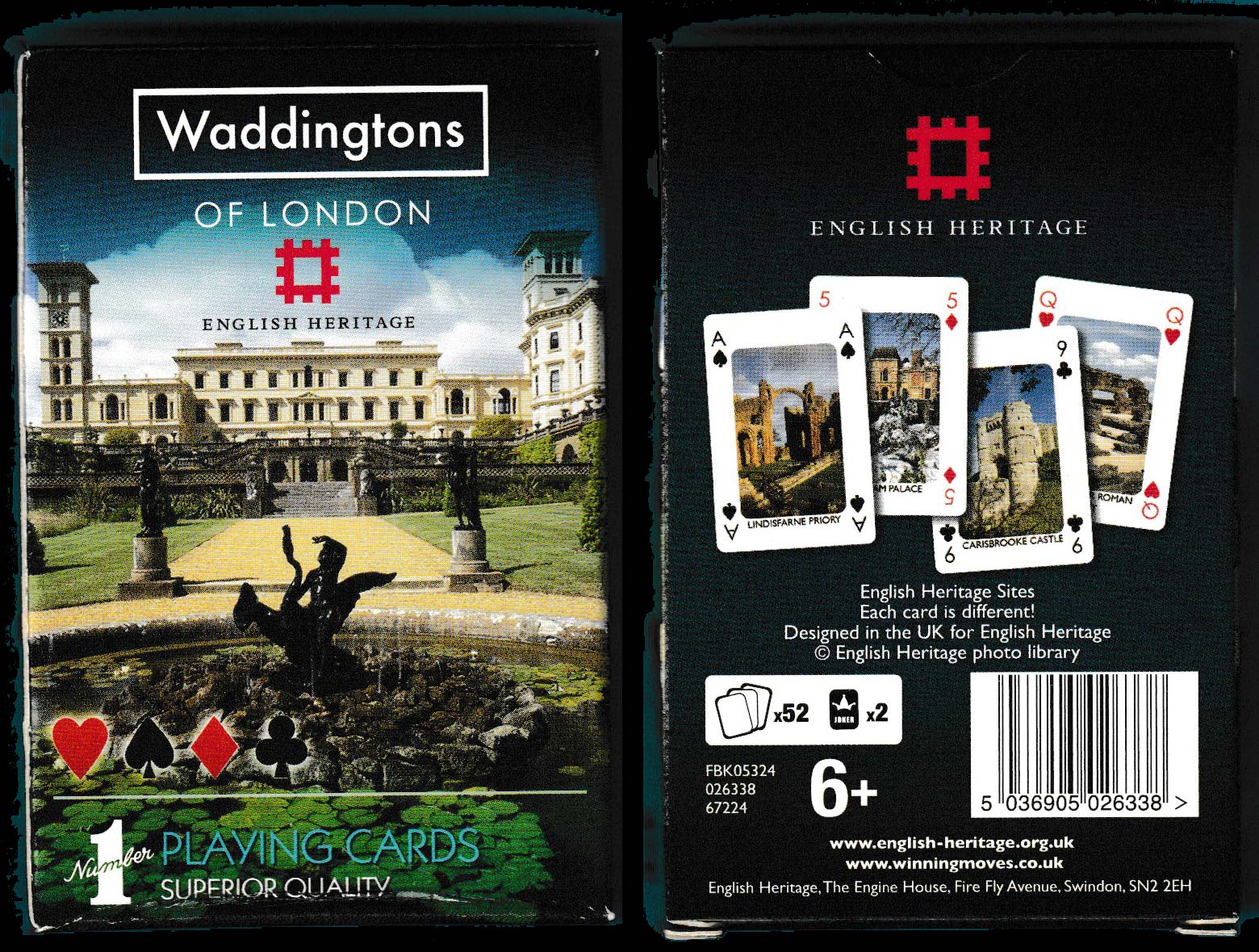 The castles, palaces, abbeys and forts depicted in this pack are all managed by English Heritage. All the photographs are in colour and in vertical format, with each site named at the foot. The quality of the photos is good but the cards lack a black liner and are therefore ‘see-through’. The English Heritage logo appears on the Jokers. On the back is a view of Osborne House on the Isle of Wight with the ubiquitous “Waddingtons Number 1” logo above and the English Heritage logo beneath • See the box
