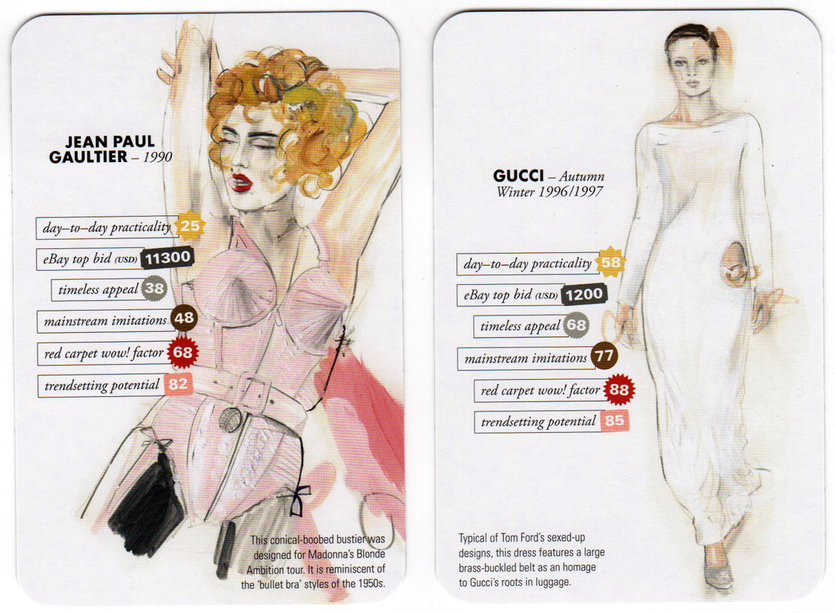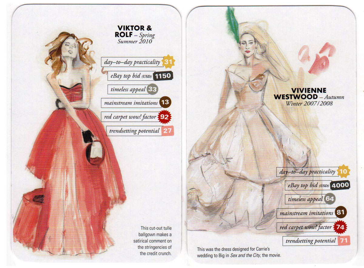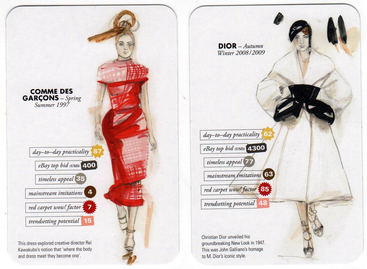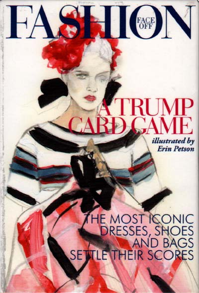 “Fashion Face Off” is a card game illustrated by Erin Petson and published by Magma for Laurence King Publishing, c.2011. Showcasing creativity in female attire, women will always seek to find their identity through fashion. The cards include some heavenly and empowering designs although others are less than practical for day-to-day wear. The game is played similar to Top Trumps. See the Instructions and Credits►