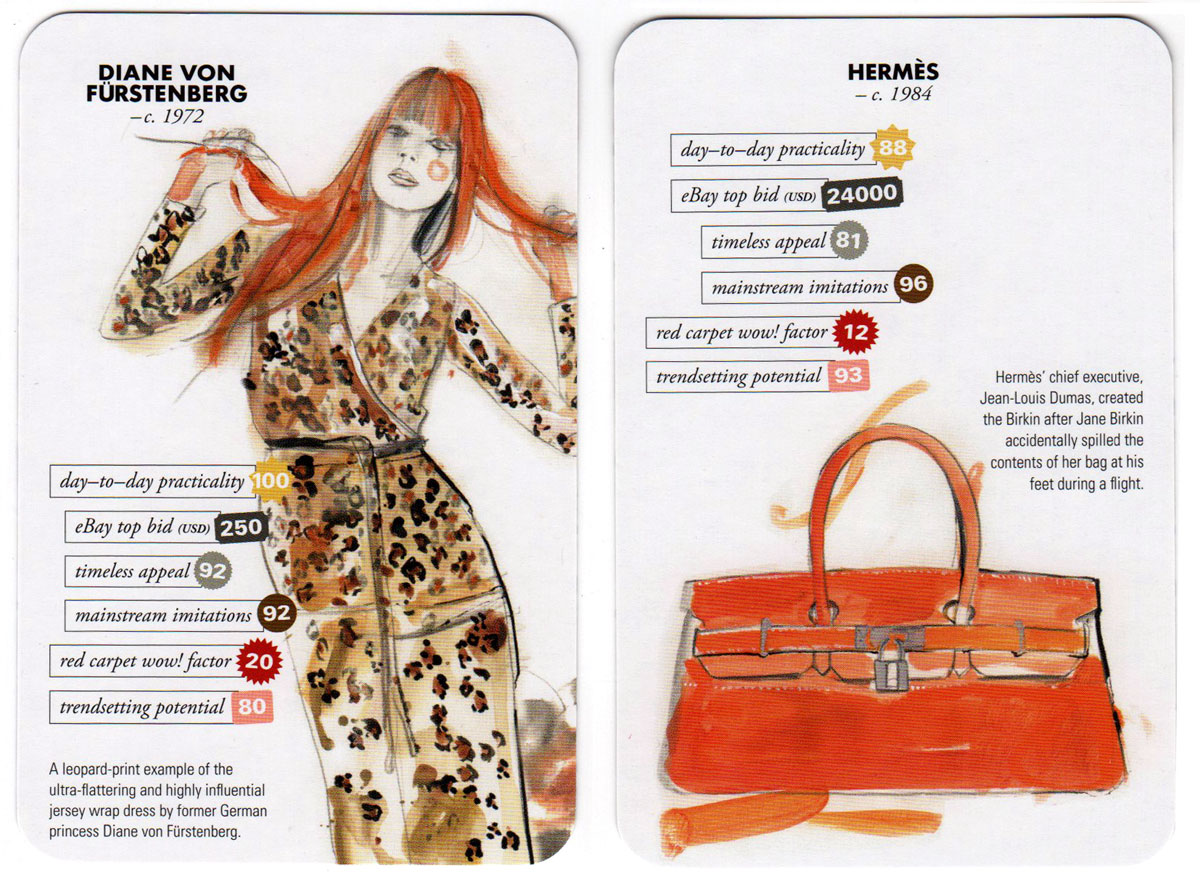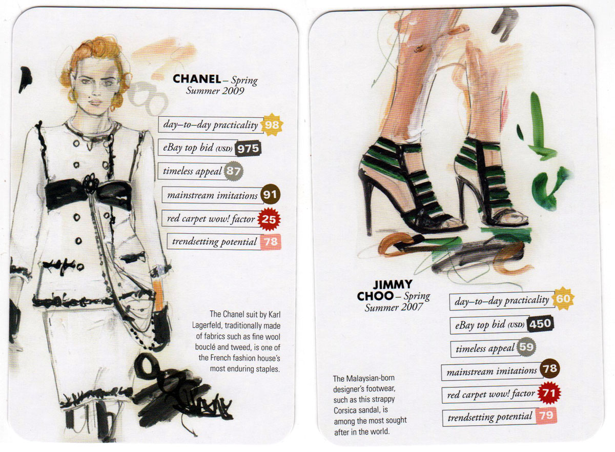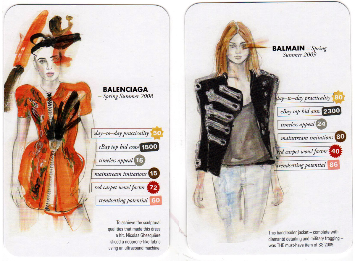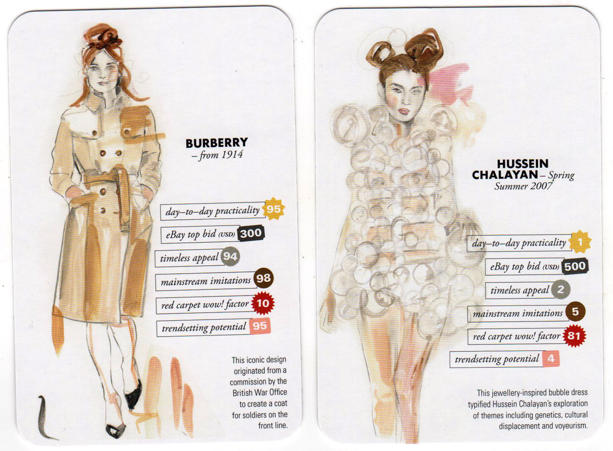 “Fashion Face Off” is a card game illustrated by Erin Petson and published by Magma for Laurence King Publishing, c.2011. Showcasing creativity in female attire, women will always seek to find their identity through fashion. The cards include some heavenly and empowering designs although others are less than practical for day-to-day wear. The game is played similar to Top Trumps. See the Instructions and Credits►