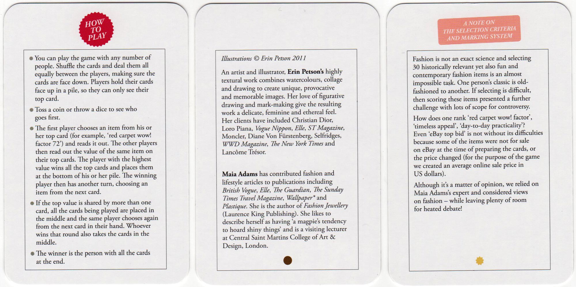 Above: “Fashion Face Off” card game illustrated by Erin Petson with research by Maia Adams, published by Magma for Laurence King, London, c.2011.