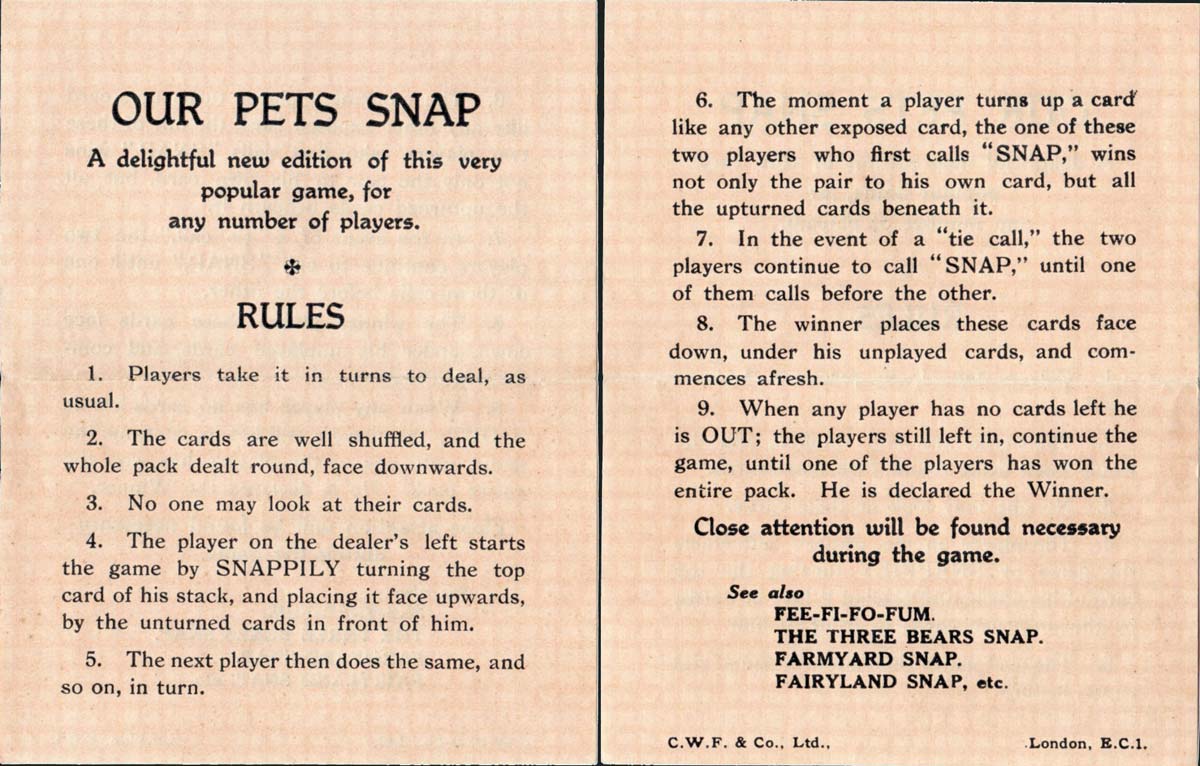 “Our Pets Snap” is one of a range of children's card games designed by A. E. Kennedy for Faulkner & Co., c.1930s. Albert Ernest Kennedy (1883–1963) was an Illustrator of children’s books mostly about animals. His charming illustrations are full of colour and personality. In this game the animals are double-ended.