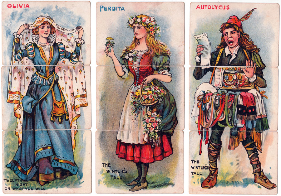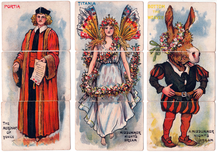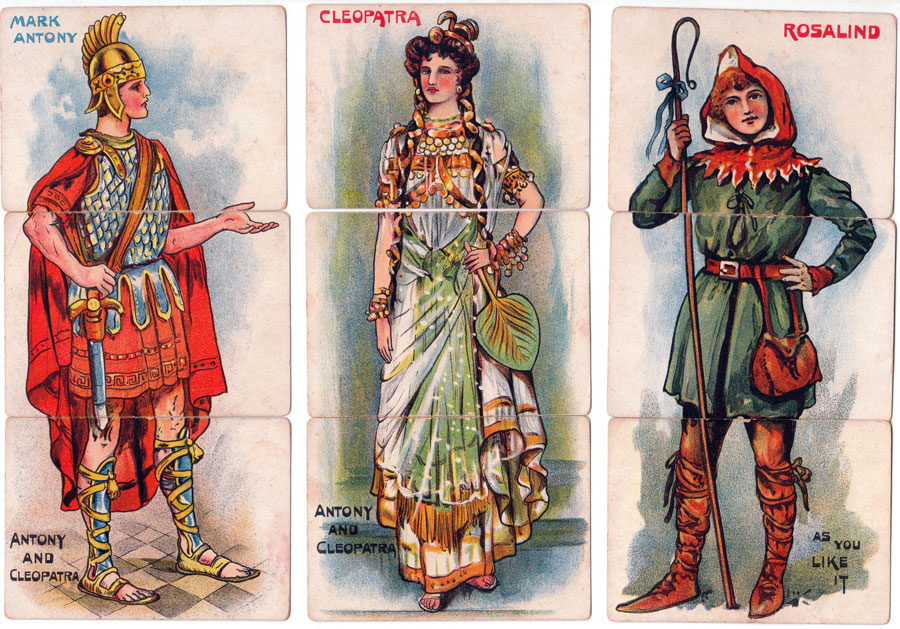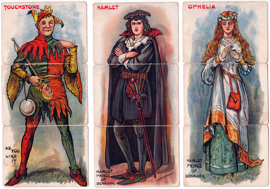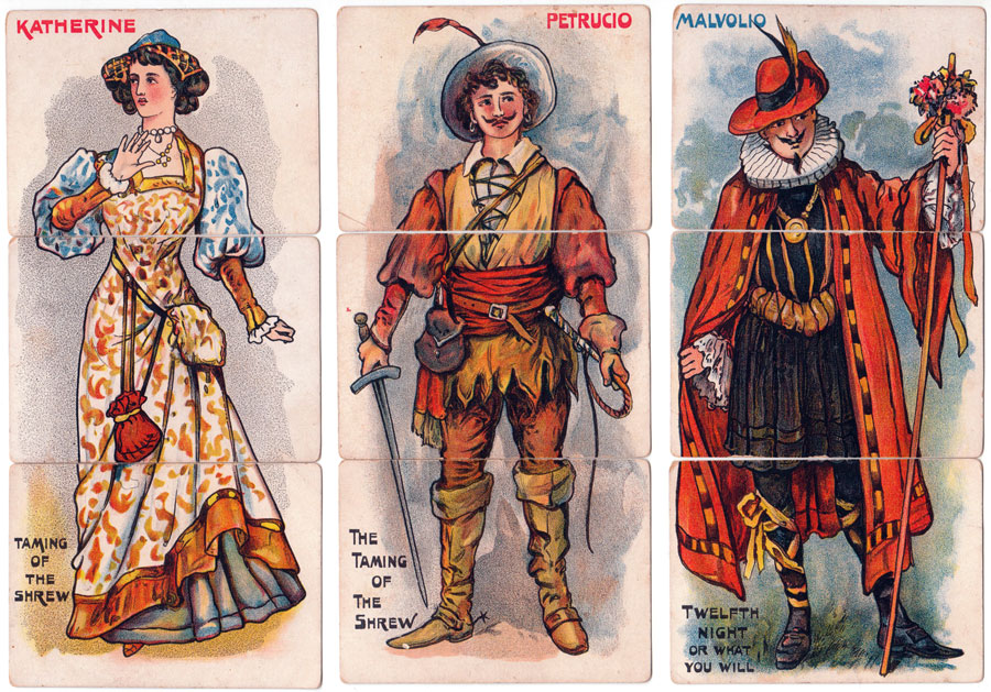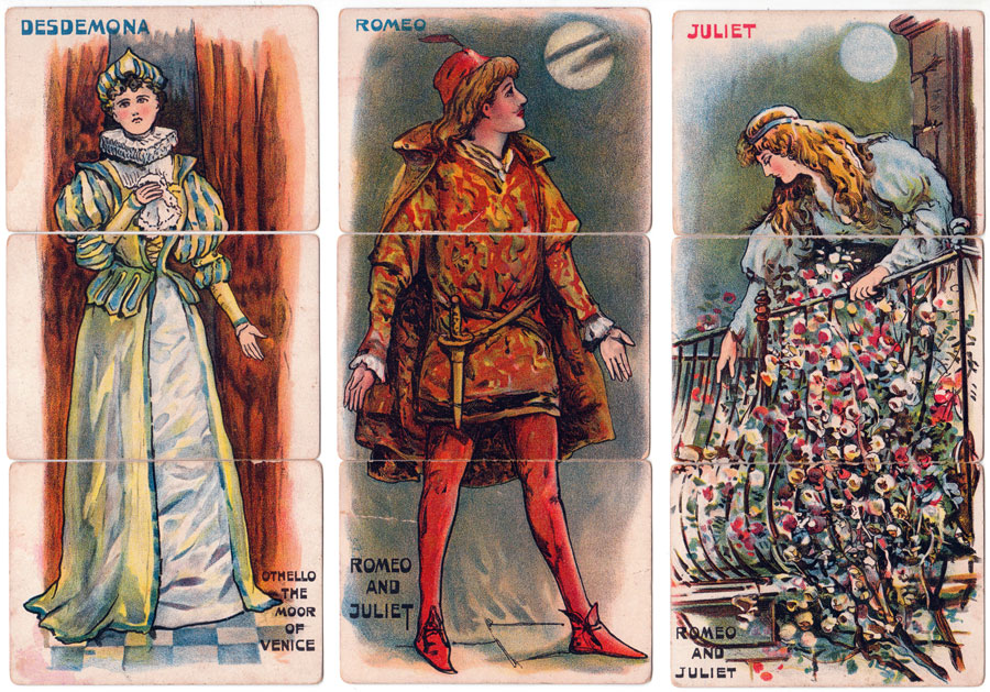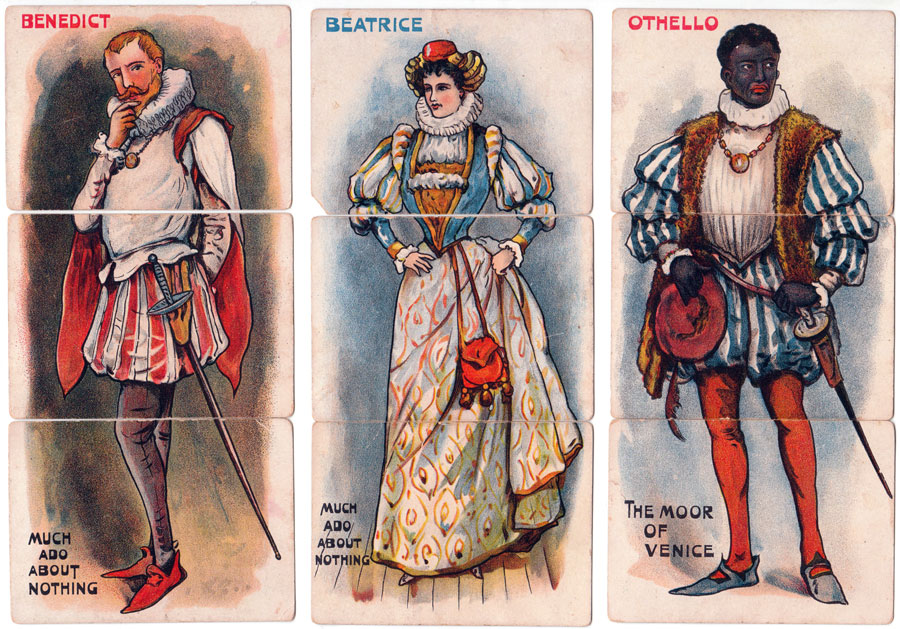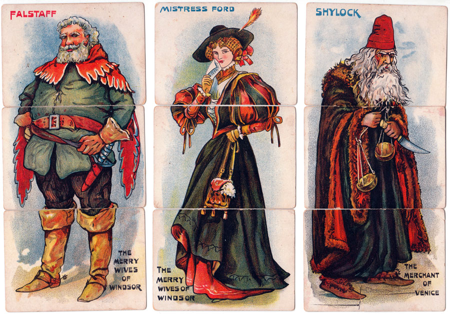 published by C. W. Faulkner & Co. Ltd, London, c.1907/08, designed by portrait painter and illustrator George Lambert ARA (1873–1930). A total of 72 cards make up a series of 24 of the most celebrated characters in Shakespeare. The idea is to match the cards correctly or to have fun mis-fitting them.