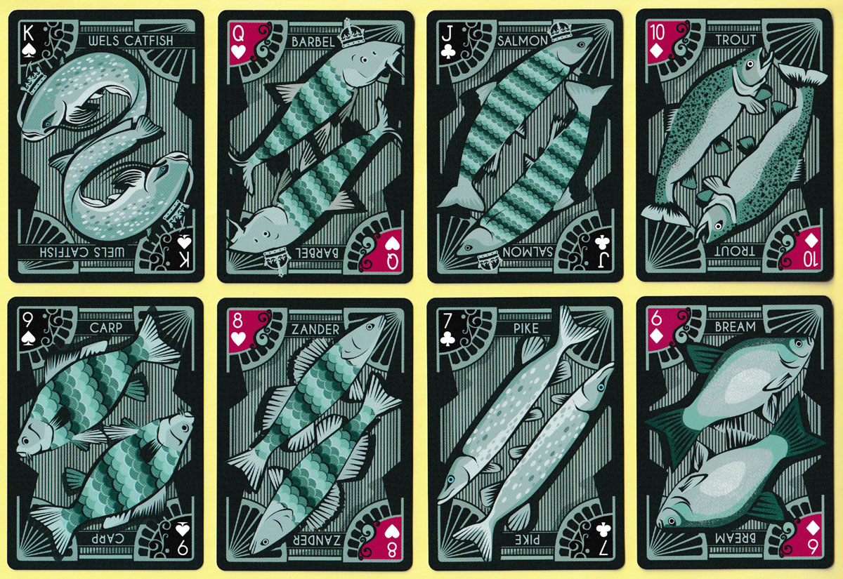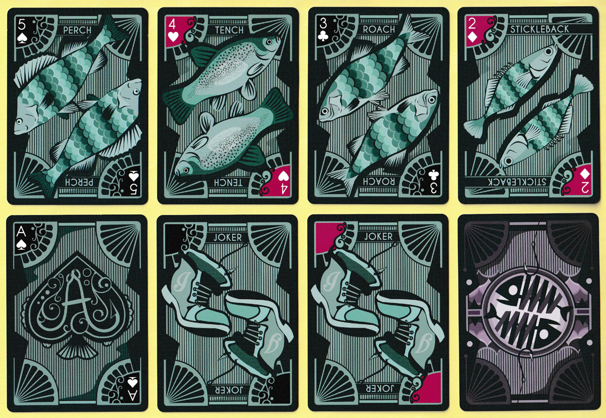 Above: ‘Fishing for Compliments’ playing cards created by Pixel Initiative, with illustrations by Stacey Jay Kelly, manufactured and distributed by LEGENDS Playing Cards Company, 2014. 52 cards + 2 Jokers in tuck box. Size: 63 x 88 mm. The box has a vague sheen, as you might get from fish skin.