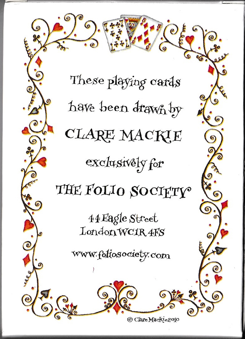 In 2009 the Folio Society published The Folio Book of Card Games, a book that featured Mackie’s artwork. This pack, published the following year in 2010, was originally given away in connection with that publication. Both the book and the playing cards feature her playful and very charming designs created exclusively for the Folio Society. See the box►