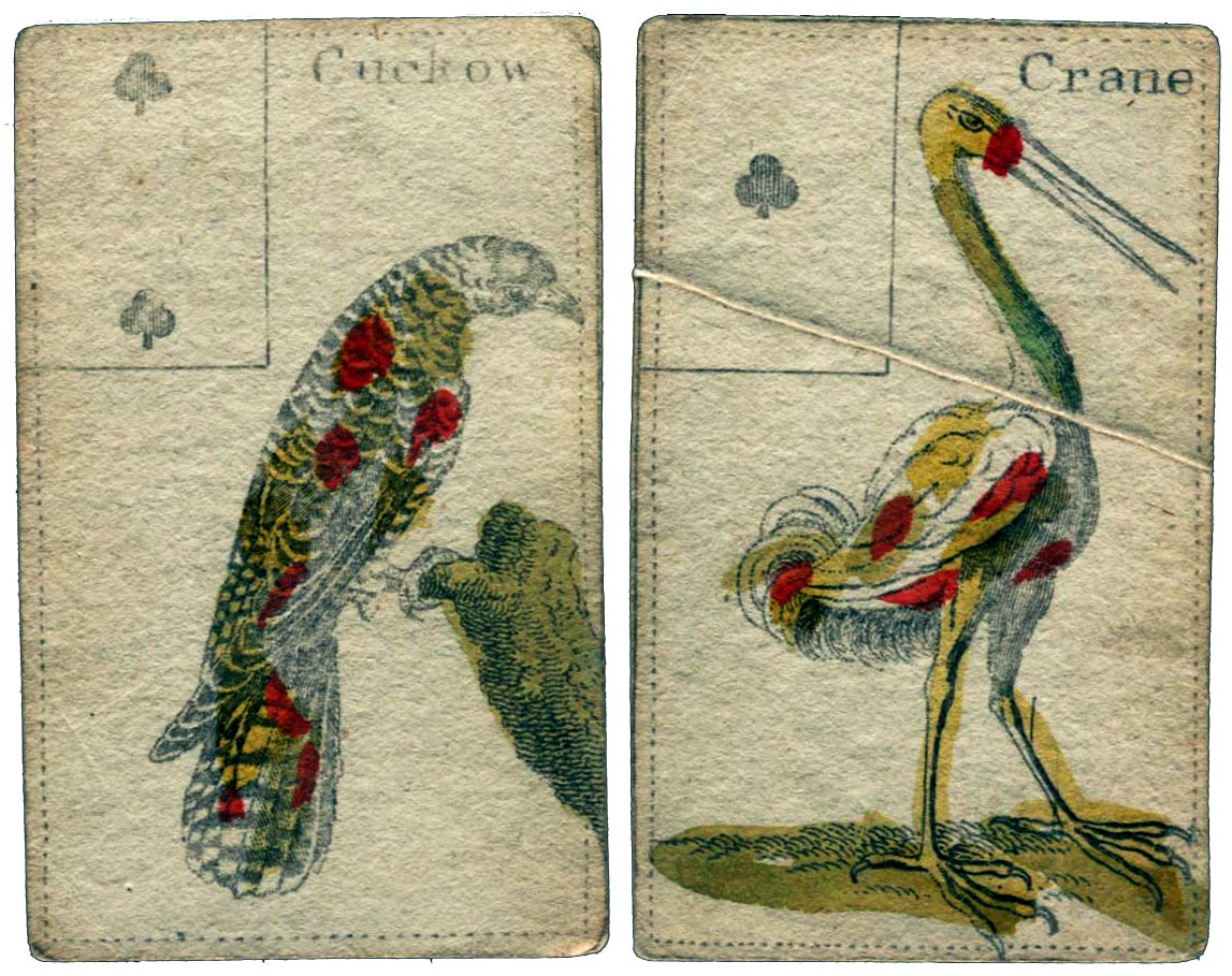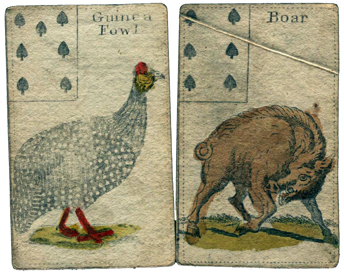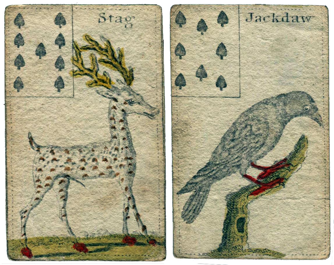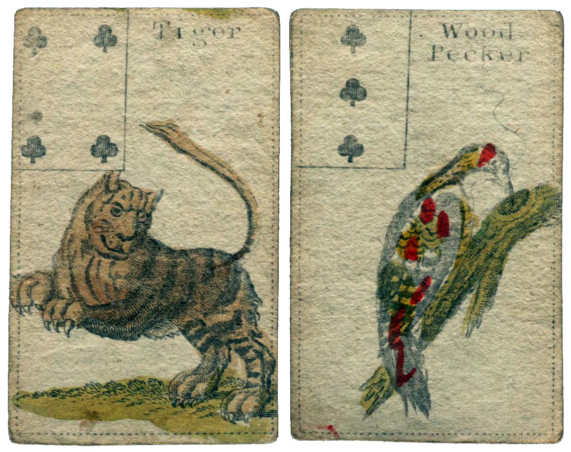 Small playing cards with a named animal or bird on each card and a dotted frame around the edge. The miniature playing cards in the top left-hand corners feature courts which are crude versions of the early single-ended English pattern. The cards are finely engraved on copper plates but the hand-colouring is lacking in finesse. However, not all the cards have been coloured in this set. It seems likely that there was an appeal to children, although initially they were produced for “Young Gentlemen & Ladys, who are Lovers of Ingenuity” - these packs were advertised as being sold in three toy shops by 1754