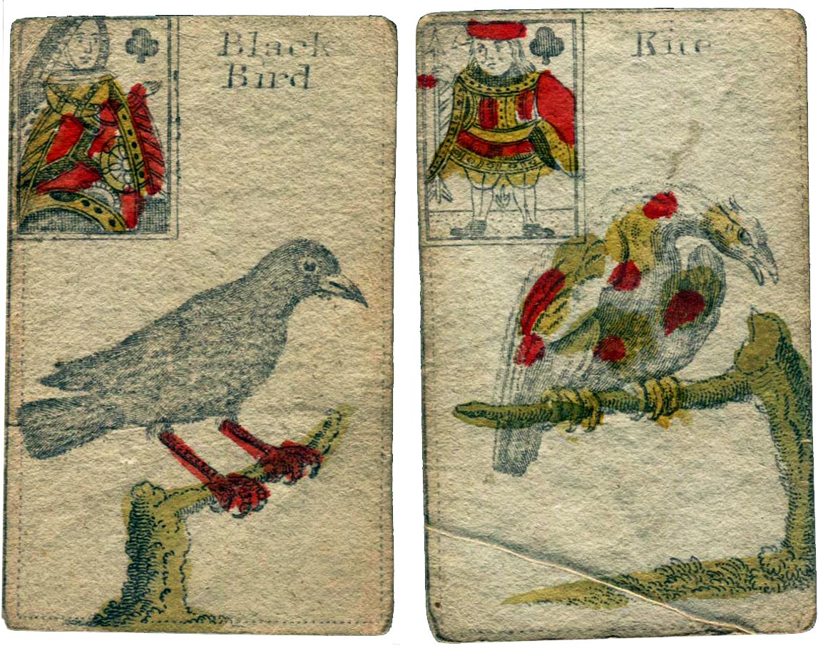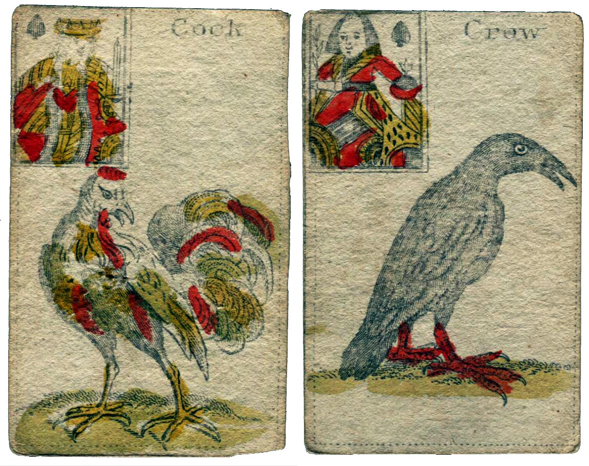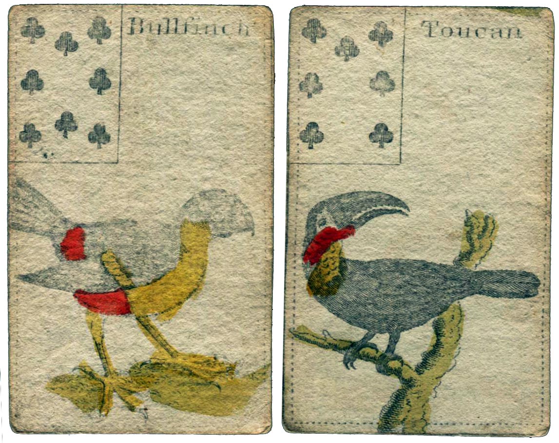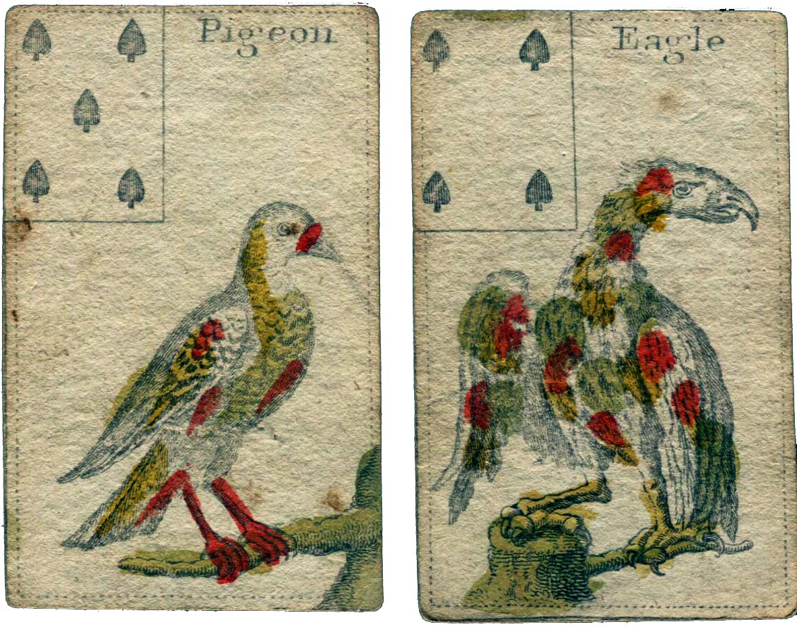 Small playing cards with a named animal or bird on each card and a dotted frame around the edge. The miniature playing cards in the top left-hand corners feature courts which are crude versions of the early single-ended English pattern. The cards are finely engraved on copper plates but the hand-colouring is lacking in finesse. However, not all the cards have been coloured in this set. It seems likely that there was an appeal to children, although initially they were produced for “Young Gentlemen & Ladys, who are Lovers of Ingenuity” - these packs were advertised as being sold in three toy shops by 1754